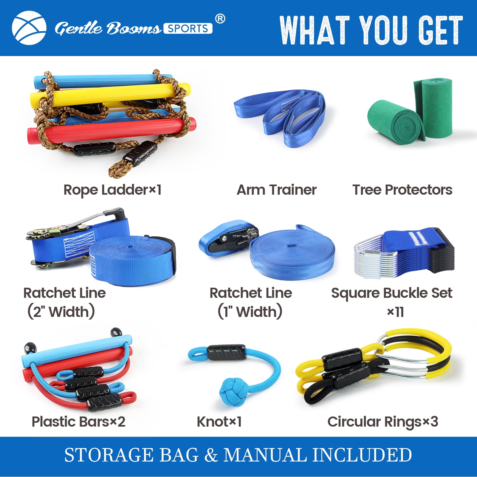 The Gentle Booms Sports Ninja Warrior Obstacle Course Set is a fun toy for the kids, which encourages your kids to get outside for hours of fun playtime! It is the perfect obstacle course set for any backyard playground. 🍎Specification: Brand: Gentle Booms Applicable Age: 5 years and up Maximum Load: 440 Pounds Sweatproof, Termite-Proof, Anti-Corrosion 🍎Perfect For All Occasions – The Ninja warrior line hanging obstacle course is quick and easy to set up, a convenient carry case lets you take it wherever you go. Perfect for all occasions, such as outdoor birthday parties, forest camping, backyards, playground, fitness class, and so on. It is also a perfect Christmas/birthday gift to your boys and girls. 🍎Easy To Install – You just need to find two trees or poles at the right distance. Our ninja line kits include a metal adjuster that could adjust the line’s length and tightness, to be suitable for a different distance and situation. And it will comes an instruction manual, adult installation only takes 5 minutes! Using our manual, you can easily set up the children’s ninja course and its fighter training equipment! 🍎Multiplayer Entertainment – The ninja warrior obstacle course has different entertainment accessories, which could be for 3 children to play. Not only children can play, but adults can also play. Gentle Booms Ninja Warrior Obstacle Course Set is ideal for sociable play, your family and friends can play together and have quality bonding time. 🍎Ratchet-Tight Technology – With the new Ratchet-Tight Technology you will never have your kid’s feet dragging on the ground when they play! Rubber-coated gymnastic ring, and industrial-strength ratchet for security, you can use the ratchet to tighten the webbing as much as possible, and don’t worry about the webbing breaking. Our webbing can withstand the breaking strength of 1.8-2 tons, and is in line with the U.S. CPC certification. 🍎1 Year Warranty: We are a PROFESSIONAL NINJA WARRIOR OBSTACLE COURSE company. We promise 1 year warranty on all ninja warrior accessories if any of them are damaged within a year. 🍎Packing Included: Ratchet line X 2 Tree Protector X 2 Accessory Band X 1 Circular Rings X 3(Black×1, Yellow×2) Plastic Monkey Bar X 2(Blue×1, Red×1) Knot X 1(Blue×1) Plastic Rainbow Rope Ladder X 1 Square Buckles Set X 11 Carrying Bag X 1(Black) English Instruction Book X1