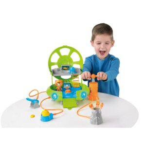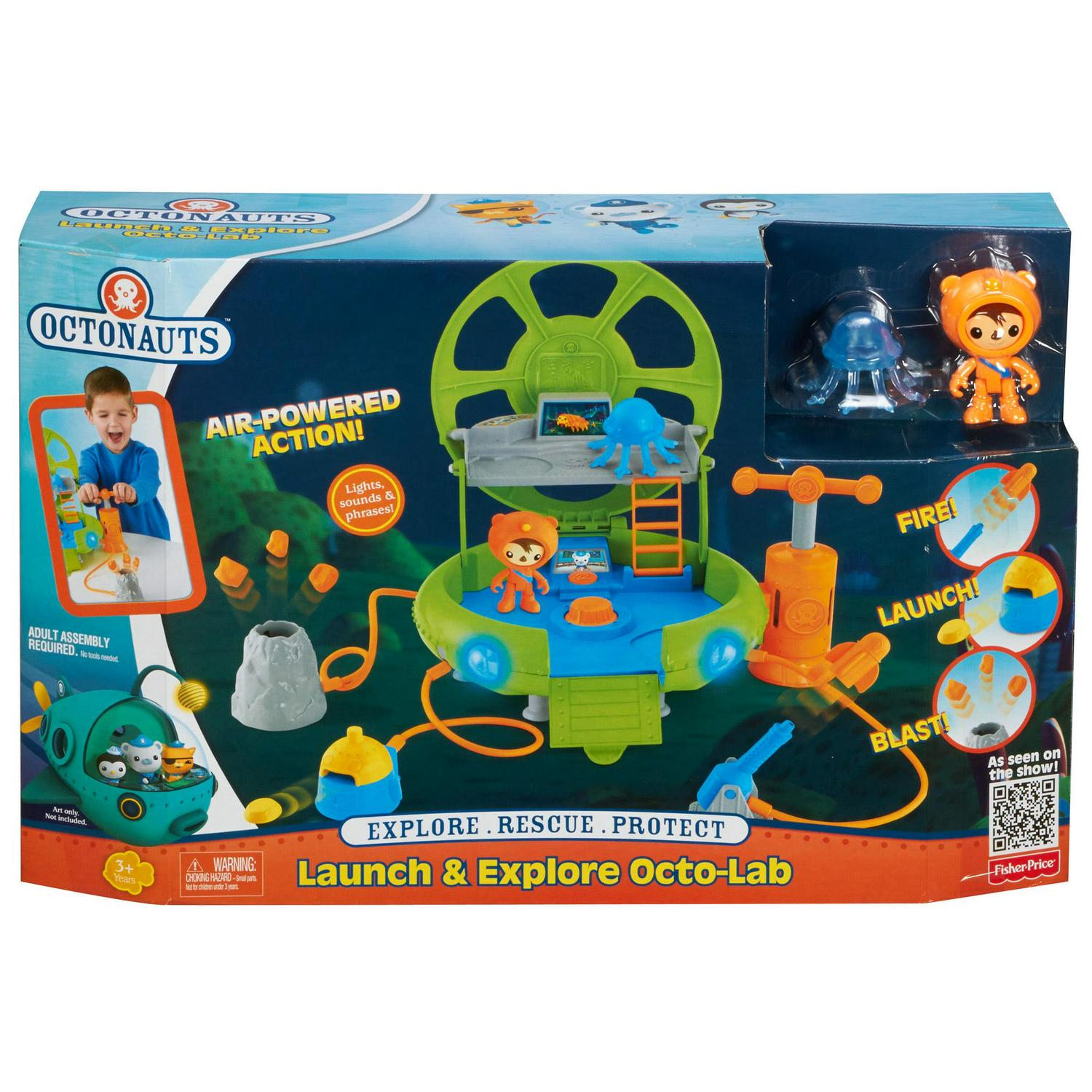 Descend to the deepest part of the ocean and explore with the Octonauts! Equipped with everything you need for midnight zone missions, the Octo-Lab opens to reveal two floors of play and air-powered rescue tools! Hook the tools up to the lab’s hoses, use the selector dial to choose the tool you want to activate, and then press the pump down to start the action! Blast lava rocks out of your path, launch a tasty kelp cake from the Vegibot or fire the rescue flare! The Octo-Lab’s eyes light up and it also features phrases from the Octonauts and fun sound effects! For mobile midnight zone missions, the air-hoses can be neatly coiled on the bottom of the lab and all play pieces can store inside!