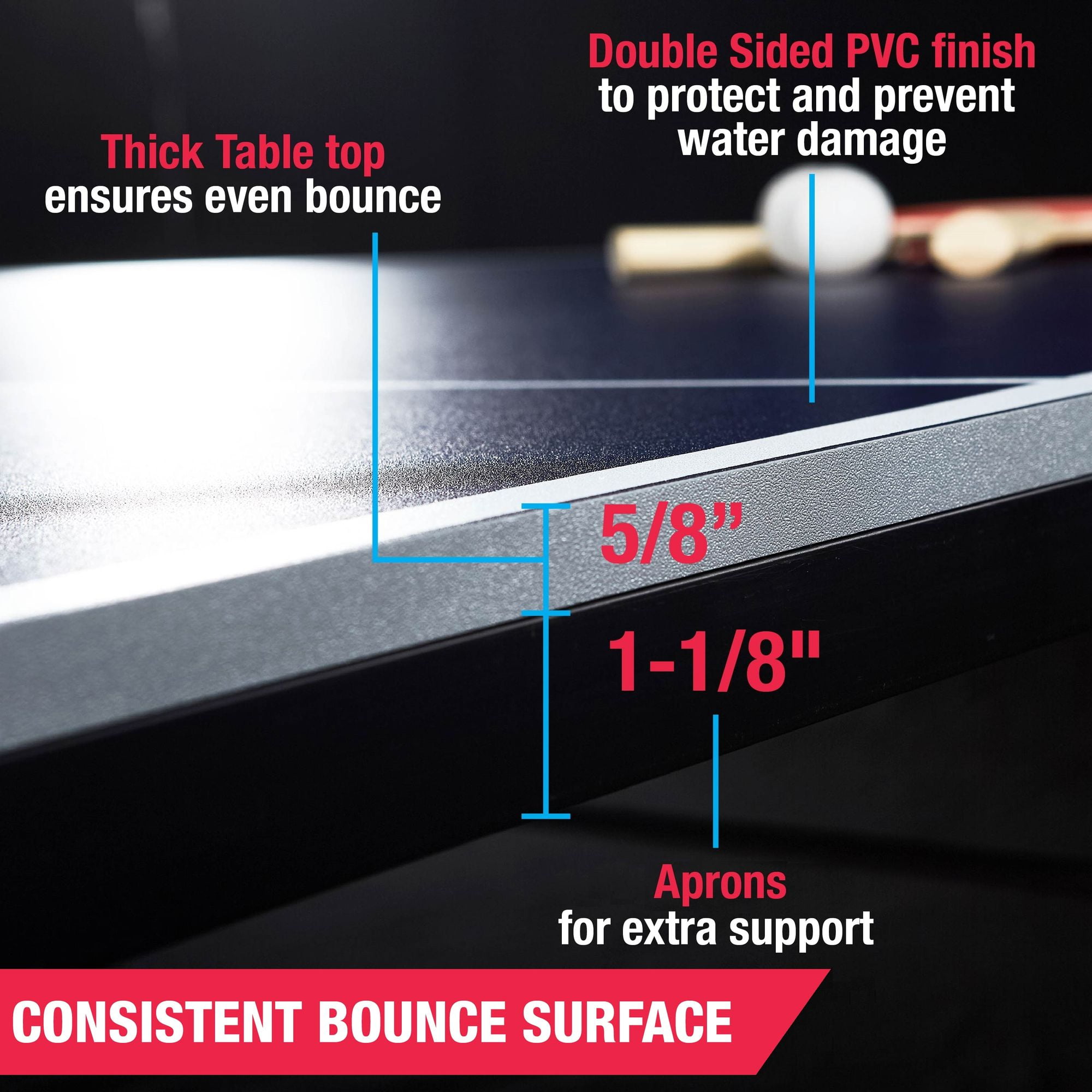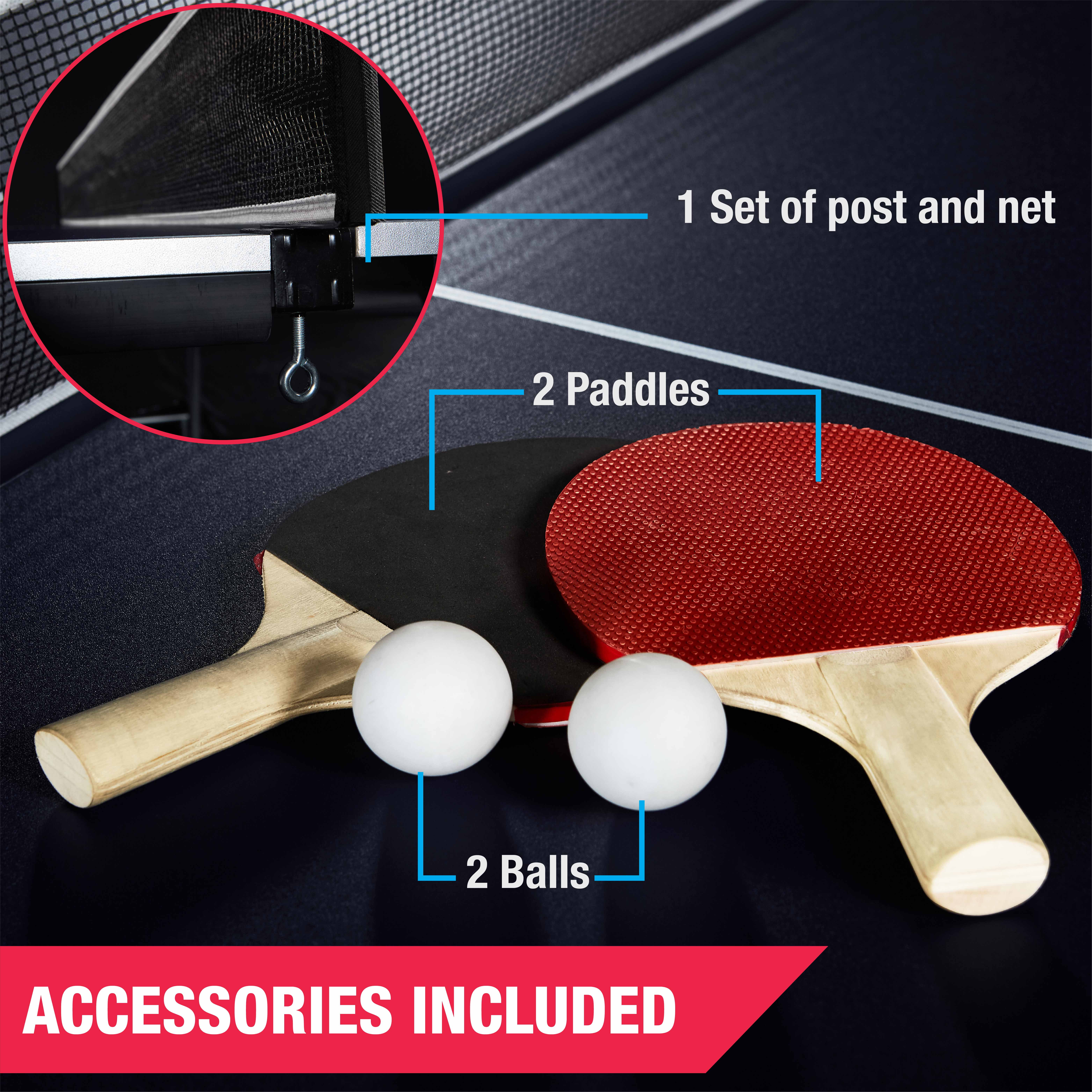 Official Size Table Tennis with Paddle and Balls, Blue and White, by MD Sports Official tournament size 9′ x 5′ table with 4-piece construction Standard 5/8″ (15mm) playfield and 1-1/8″ aprons for additional support 4-piece table tennis set has a fold-up design for easy storage Top offers bounce and authentic MD Sports table tennis playing experience Waterproof PVC finish protects and seals the surface Underside is sealed with a PVC finish in order to prevent water damage or warping 1-1/4″ diameter steel leg construction with a stability panel 2″ double lockable casters Corner caps to protect walls Lift 1 side of the table vertically Includes all of the accessories needed to play Full accessories included: 1 net, 2 posts, 2 paddles, 2 balls Assembled product dimensions: 108″L x 60″W x 30″H Packaging dimensions: 59.25″L x 35.63″W x 6.3″H Weight: 138.89 lbs Model number: TTT415_027M