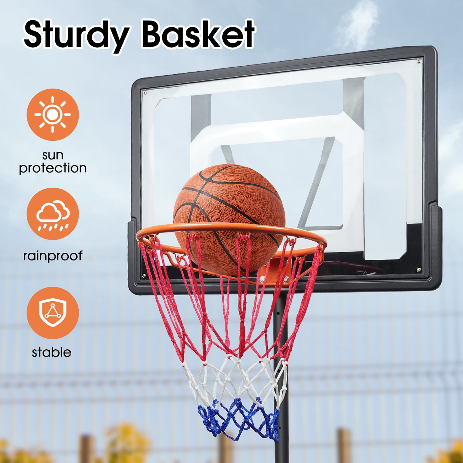 【Portable Basketball Hoop System】 OGEDNAC brand new basketball goal is the epitome of portability, designed to move with ease, making it perfect for outdoor activities and on-the-go fun, allowing you to set up a game wherever you go. 【Effortless Height Adjustment】 Adjust the basketball hoop’s height from 5 to 7 ft to suit any player’s needs, with no tools required for the adjustment process,which makes it ideal for every age and skill level. 【Durable Frame with Permanent Bonding】 The backboard frame of this adjustable basketball hoop employs a permanent bonding process that prevents cracking, even with thermal expansion and contraction. Durability meets play with our 44-inch shatterproof backboard, crafted from robust PVC plastic material to withstand the most vigorous games. 【Outdoor Ready】 Tailor-made for the outdoors, OGEDNAC basketball goal stands up to the elements and provides endless entertainment and a perfect fit for any backyard,garage or outdoor court. 【Multi-Age Appropriate】 Designed to grow with your family, this basketball hoop is suitable for kids and adults alike, offering adjustable fun for everyone.