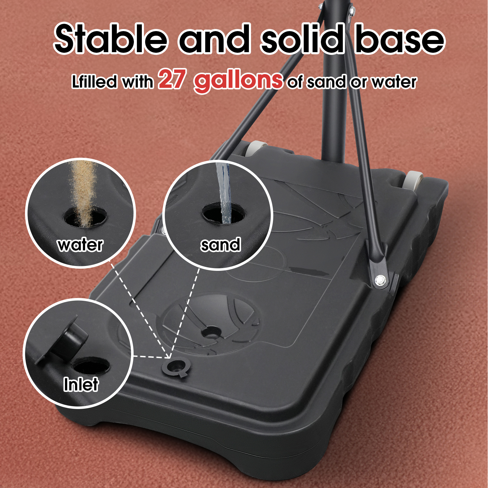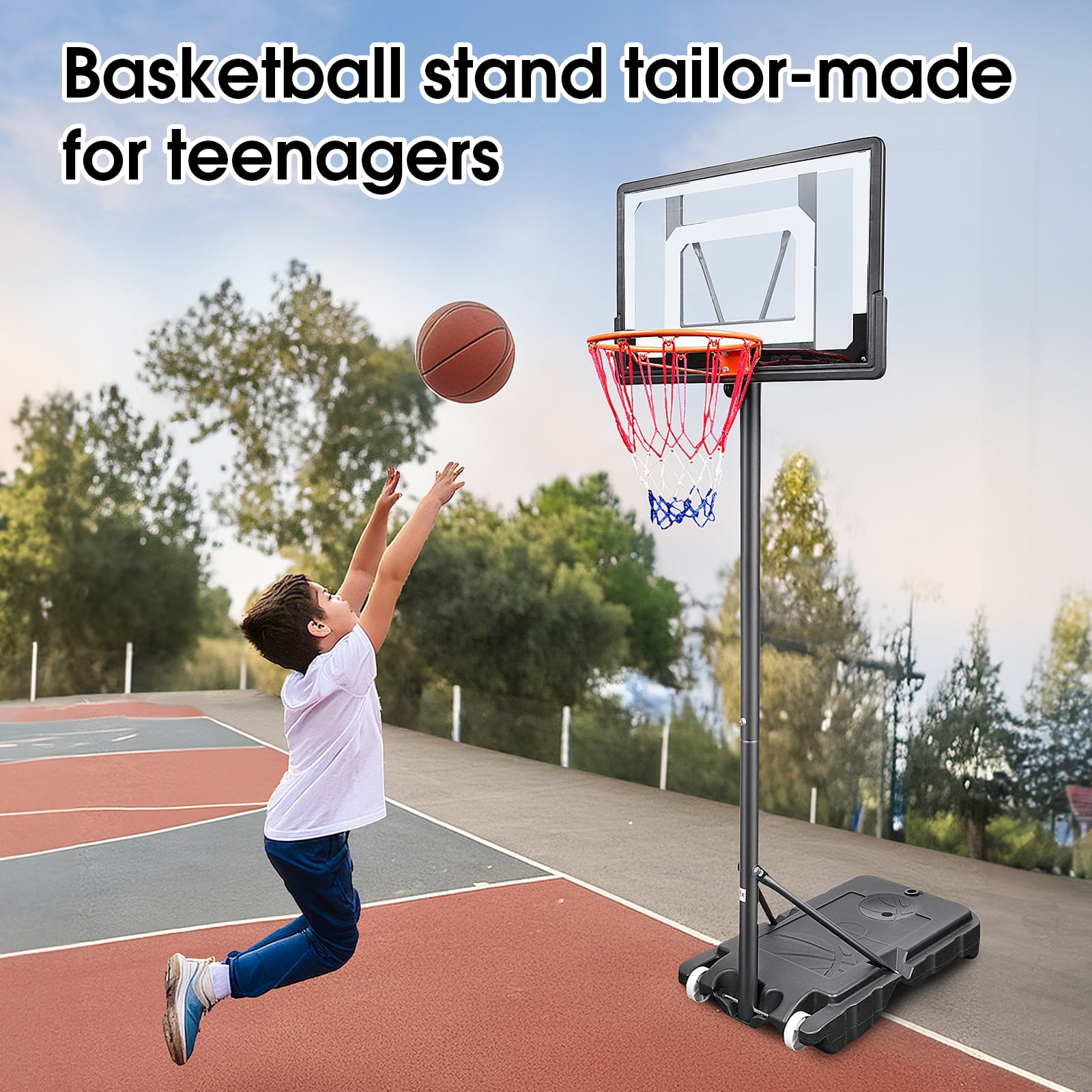 OGEDNAC Portable Basketball Hoop Outdoor, 5ft-7ft Height Adjustable Basketball Goal System with Wheels and 44″ Shatterproof PC Backboard, Basketball Hoop & Goal for Kids/Teens/Adults Sturdy Basketball Hoop It is made of sodium bicarbonate and is shock and weather resistant. Its edges are wrapped in an alloy frame and additional metal trim, making it more robust and durable. Premium PVC Plastic Backboard The design of the horn bracket and shock absorber reduces the impact of the collision, effectively buffering the impact of the impact and protecting your safety. Removable Base Design It features a new base design with two wheels that allow it to move indoors and out. You can only fill water and sand, you can only place weights in the groove, or you can fill water first and then place weights to make its support more stable. Easy to install This basketball stand does not require drilling, allowing you to install it easily and adjust different heights flexibly. Specification: 5 Levels Height Adjustable : 5ft – 7ft Backboard Dimensions:33″x 23″x 6“ Base size: 29.5″ x 17.7″ x 4.7″ Rim Diameter: 15″ Basketball Hoop material: PE+PVC Backboard Type: Freestanding Package Includes: 1 x OGEDNAC Portable Basketball Hoop