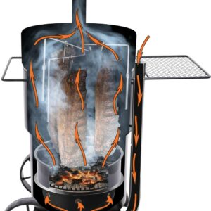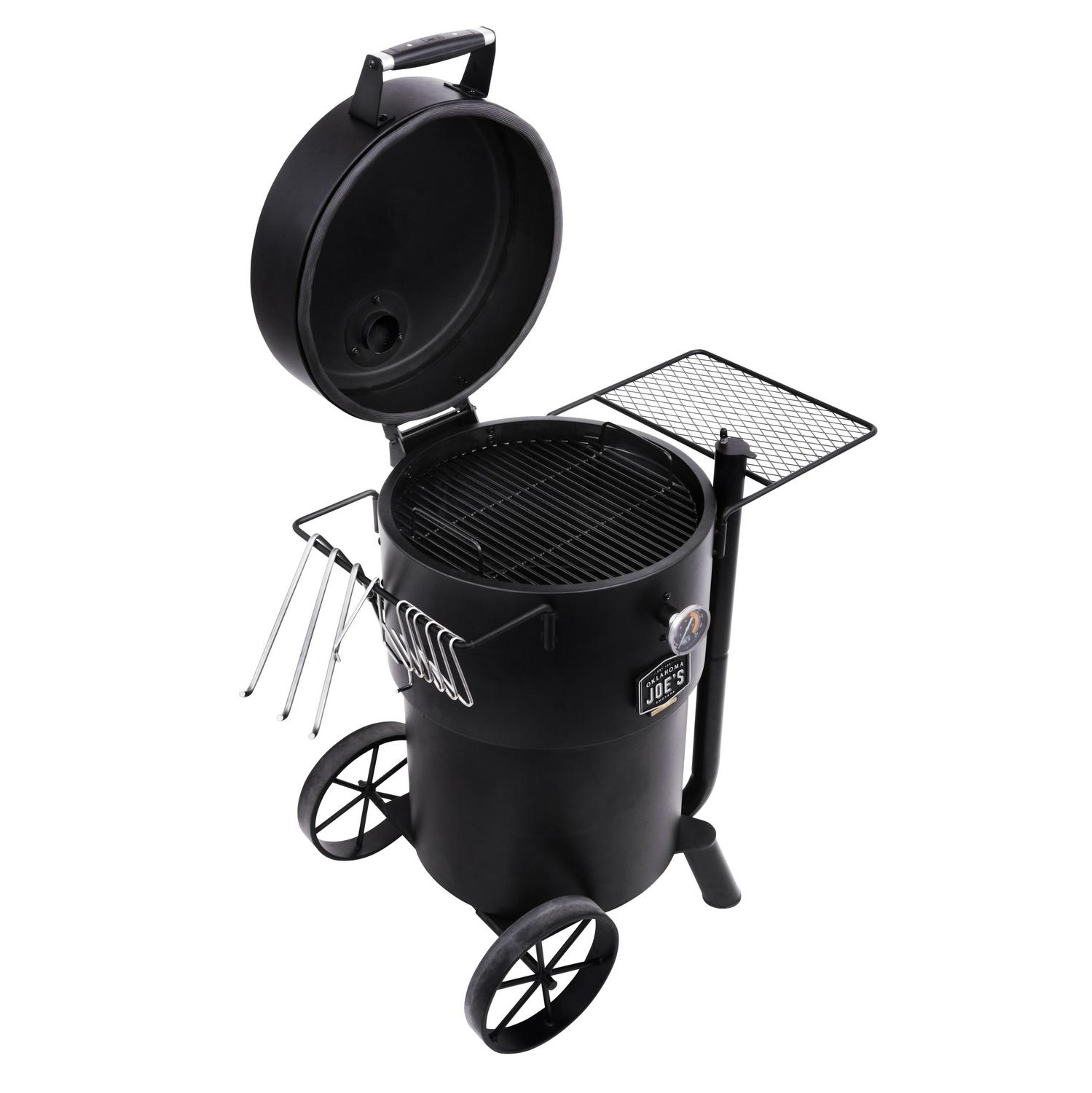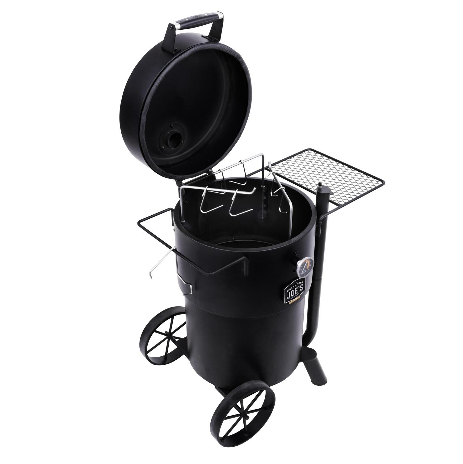 The Oklahoma Joe s Bronco Drum Smoker is a heavy-duty workhorse with a focus on customization and precision. Its movable cooking grate and additional meat hangers let you create your ideal setup, then the unique airflow control system works with the sealed lid to lock in smoky deliciousness for hours. The Cooking grate and meat hangers enable a customizable smoking setup for all your smoking needs. The oversized charcoal basket holds enough charcoal for all-day smoking, and once you re done, clean-up is no problem with the removable ash pan and porcelain-coated components. The smoker is made of heavy-gauge steel construction ensures durability you can trust for years to come. Rubber handle grips are easy to grab and stays cool to the touch. Professional temperature gauge with glow-in-the-dark accents to provide that perfect lighting. Large, wagon-style wheels make the smoker easy to move. The Drum Smoker easily converts to a charcoal grill for added versatility for all your smoking needs.