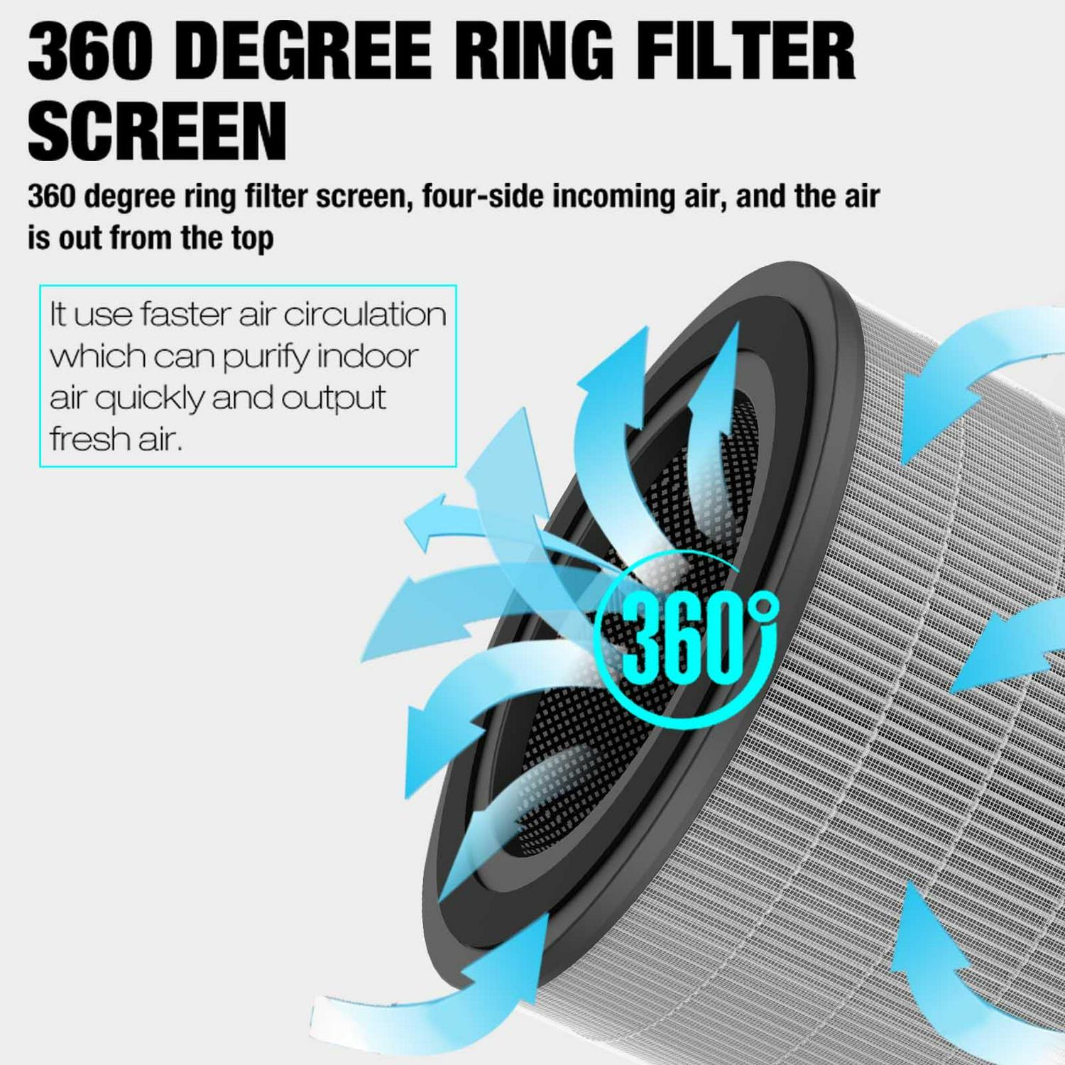 Our HEPA air purifier features advanced 5-stage filtration for 360° purification. The True HEPA H13 filter captures tiny particles as small as 0.3 microns, optimizing your home’s air quality.