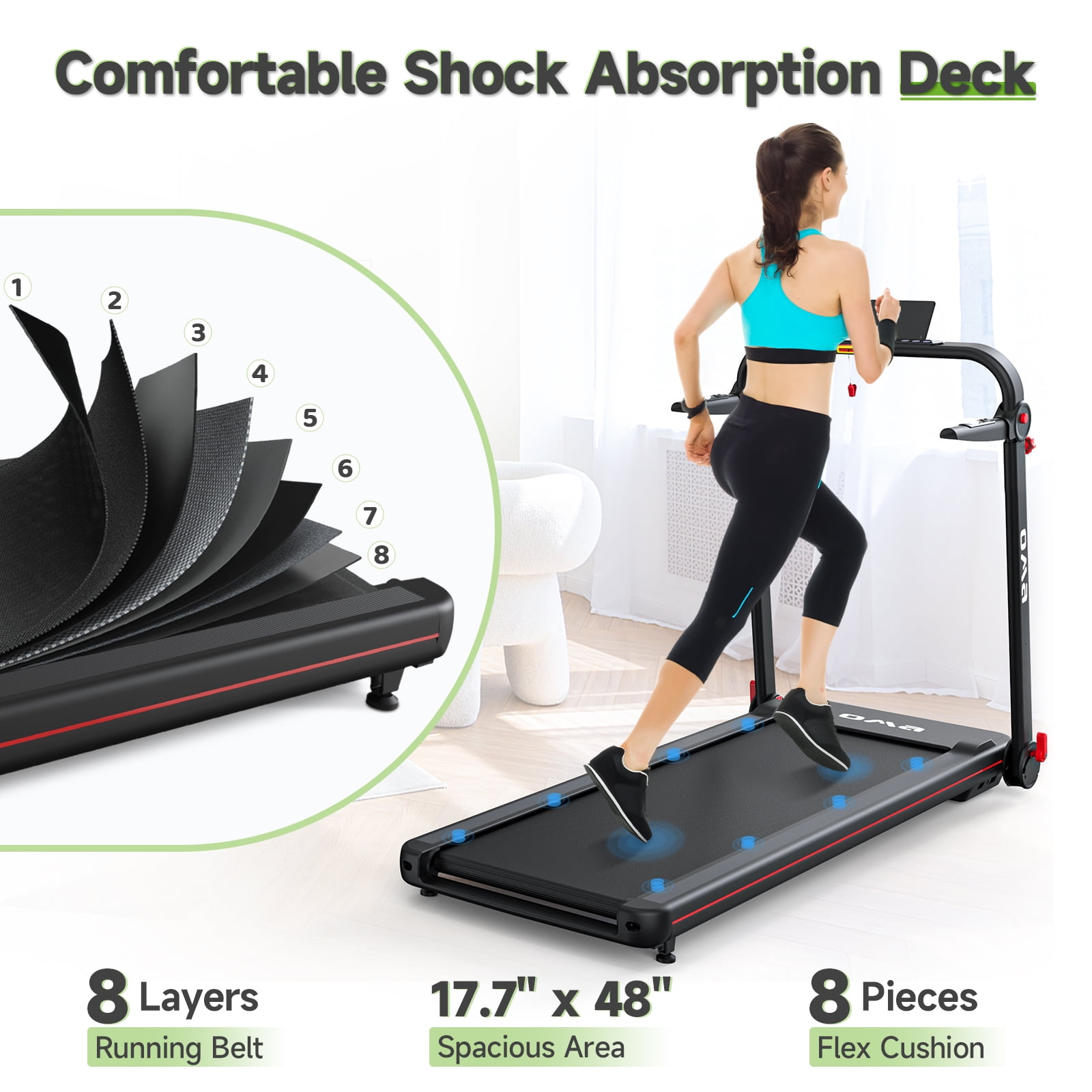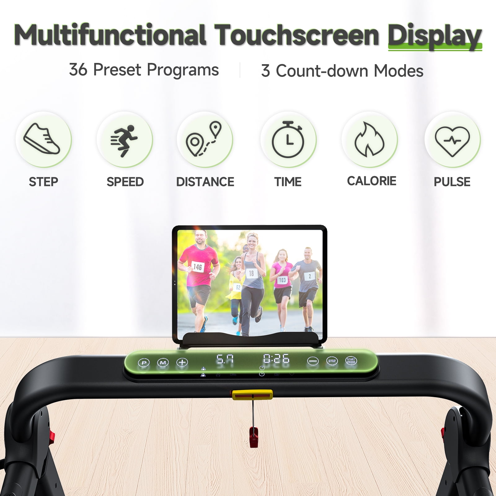 Intuitive Display: Our touchscreen display is simple to track your important workouts stats like step, time, speed, distance, and calories. 36 preset programs and 3 count-down modes offer variety for your workouts to optimize your exercise. 8-layer Running Belt: With 48″x17.7″ larger running surface, our cushioning not only accommodates different stride lengths, but also better protects your joints and keep workouts comfortable. 2.5HP Powerful Motor: The powerful motor is designed to support effective running and cardio training, powers the treadmill at speeds from 0.6-8.7MPH, offers a quiet workouts environment. Quick Access Handle: While taking your workouts, you could easy and fast to change speed on the handlebars. With these hand pulse grips, you could also monitor your heart rate at any time. 2.5HP Powerful Motor|300lbs Weight Capacity|17.7âx48â Cushioning Running Belt|36 Preset Programs|Easy to Fold and Move
