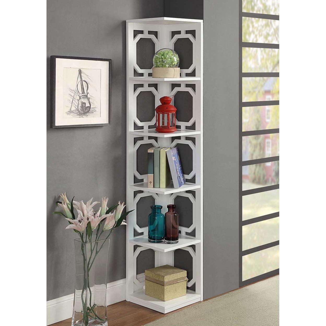 Omega 5 Tier Corner Bookcase, White Completely transform an unused corner with the help of the Omega 5 Tier Corner Bookcase by Convenience Concepts. Featuring a contemporary style, this spacious corner tower will update your home decor and optimize your storage and display capacity. With geometric side designs, it will bring a fashionable and unique look to any room in your home. Boasting 5 ample shelves, this furniture piece provides enough space for all your books or favorite collectibles. Constructed from MDF and finished with a beautiful non lead based paint. Add to your living room, den or home study just minutes after delivery with its easy 4 step assembly. Available in multiple finishes to complement any style. Complete the look with additional pieces from the Omega Collection by Convenience Concepts. Each sold separately.