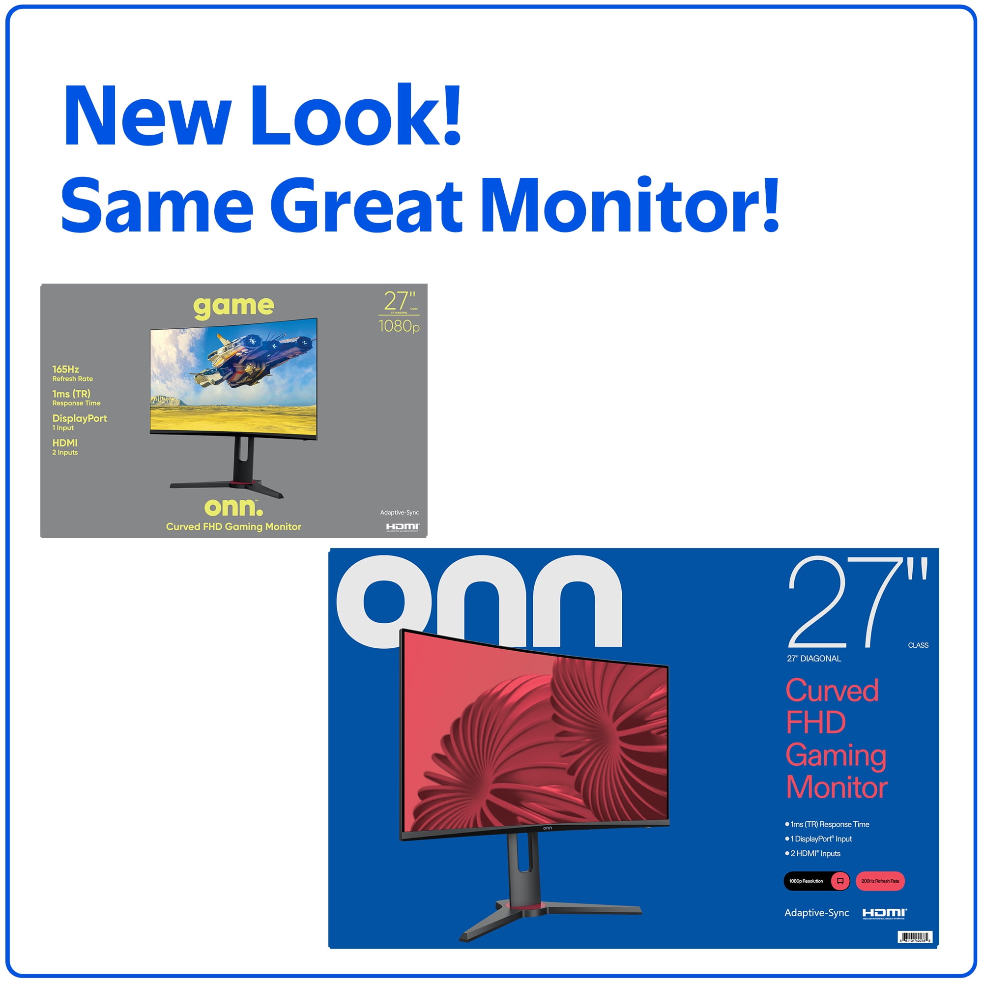 onn. 27″ Curved FHD (1920 x 1080p) 165hz 1ms Adaptive Sync Gaming Monitor with Cables, Black Full HD 1920 x 1080p resolution 165Hz refresh rate 1ms (TR) response time Adaptive-sync technology Monitor curvature 1500 mm Anti-glare screen with low blue light adjustment Stand adjusts: Height (+80mm), Tilt (+25 degrees/-5 degrees), Swivel (+/-30 degrees) VESA pattern: 100 x 100 mm Windows and Mac compatible Connections: 1 DisplayPort, 2 HDMI, and 1 headphone What’s in the Box? 1 FHD gaming monitor (27″), 1 DisplayPort cable 6 ft (1.85 m), 1 HDMI cable 6 ft (1.85 m), 1 AC adapter and power cable 6 ft (1.85 m), 1 monitor stand, 1 Quick Start Guide