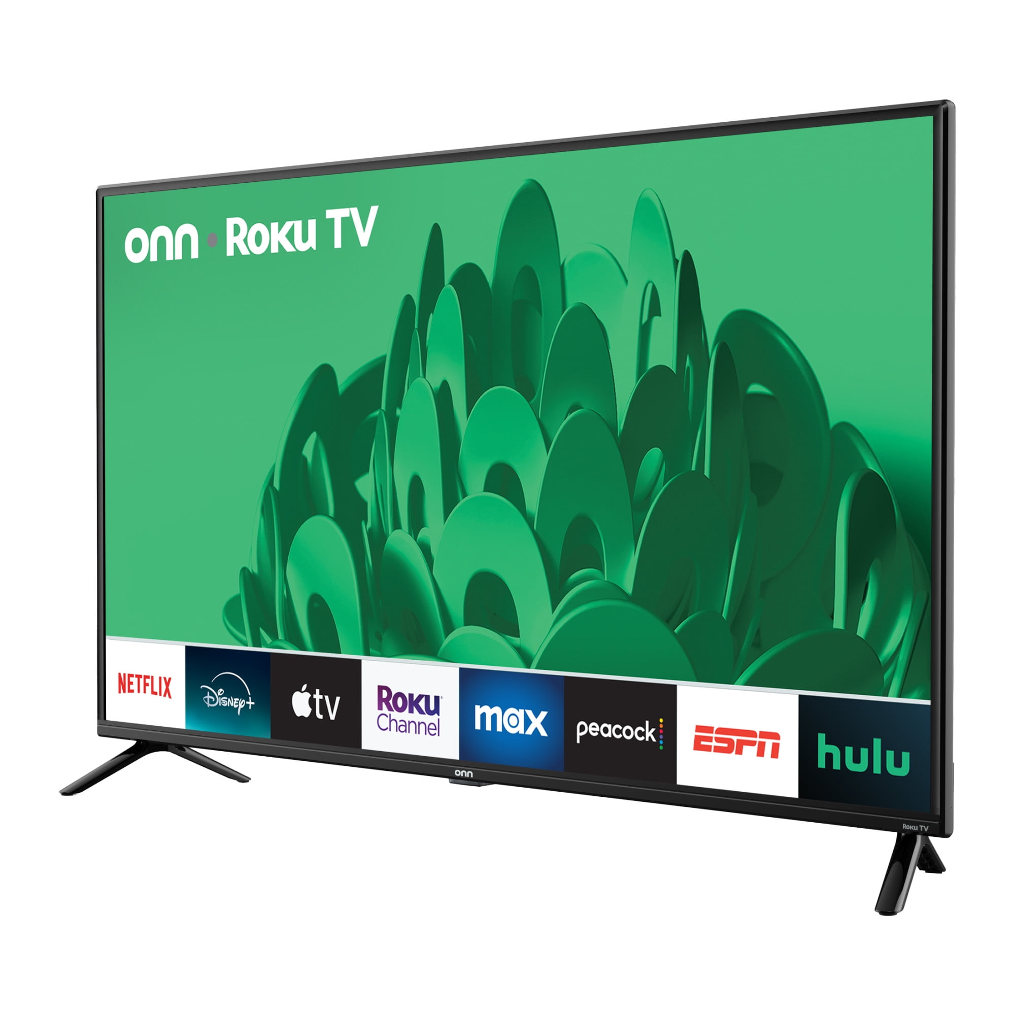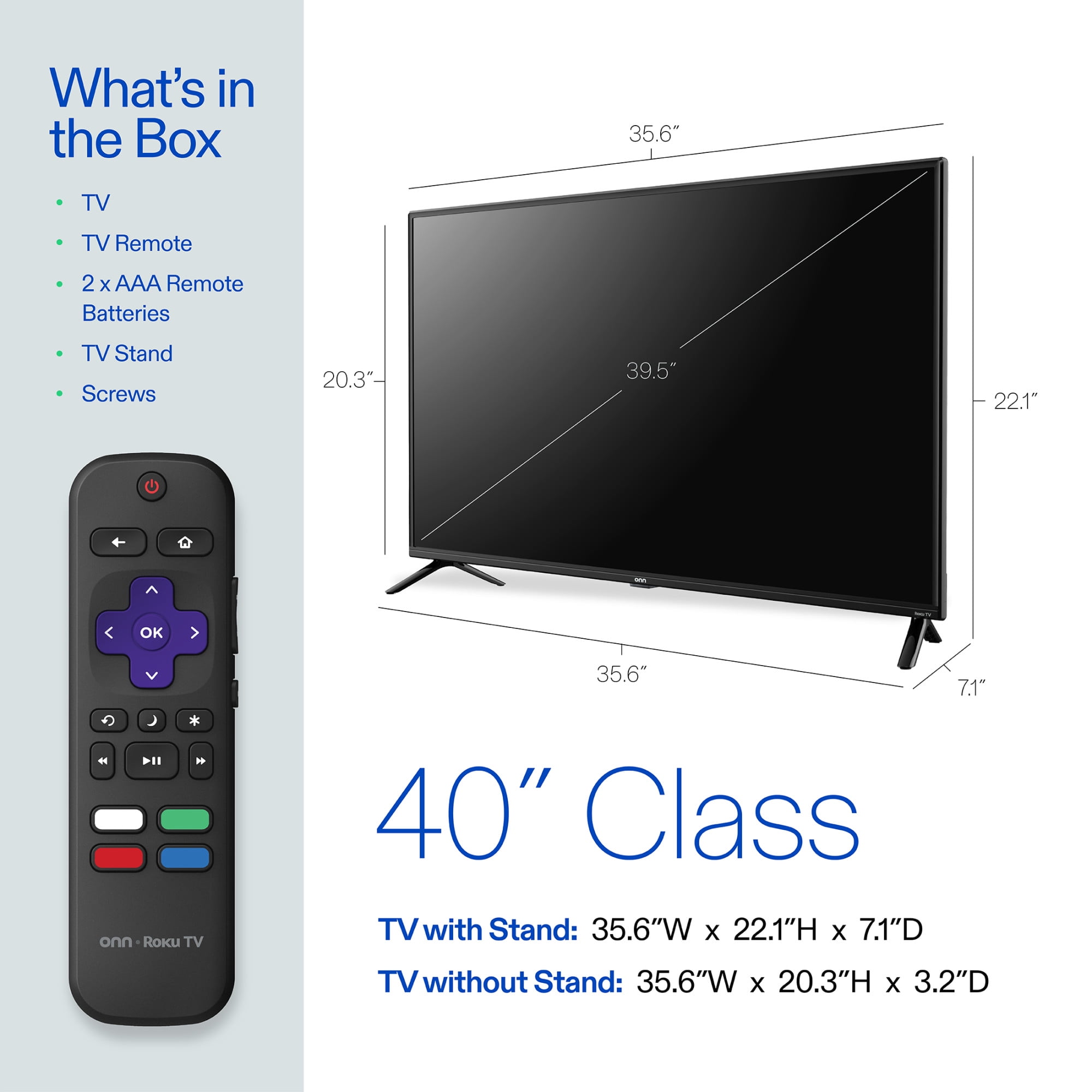 40” (39.5” actual diagonal) 1080p FHD LED TV 1080p Resolution – Crystal clear picture, bringing out more lifelike color, texture and detail Roku Smart TV – wirelessly stream 500,000+ movies and TV episodes available across thousands of free or paid channels, conveniently presented through your own customizable home screen Free Mobile App – Can’t find your remote? Use the Roku mobile app on your smartphone for browsing channels or voice control Smart Home Ready – Works with Apple Home, Amazon Alexa, and Google Home 60hz Refresh Rate – Smooth motion while gaming or watching sports VESA Mount Compatible: 200 x 200 mm Connections: 3 HDMI, 1 composite, 1 USB, 1 optical, 1 coaxial/cable and 1 headphone What’s in the box? 1 onn. Roku TV 40”, 1 Roku TV remote control (batteries included), 1 Quick Start Guide, and 1 TV stand + hardware