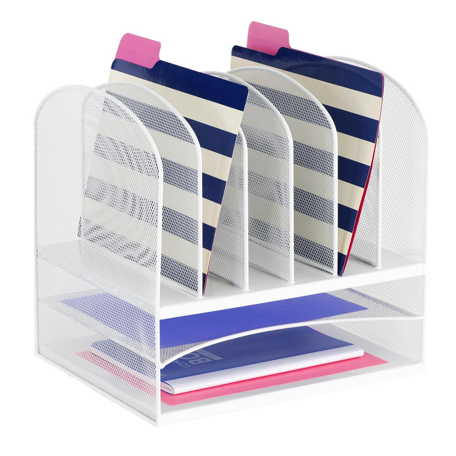– The Onyx wire mesh desktop organizer features 2 horizontal letter-sized trays and six 2″ wide, upright file sections on top. The durable steel mesh design aids in office supply organization and file storage.