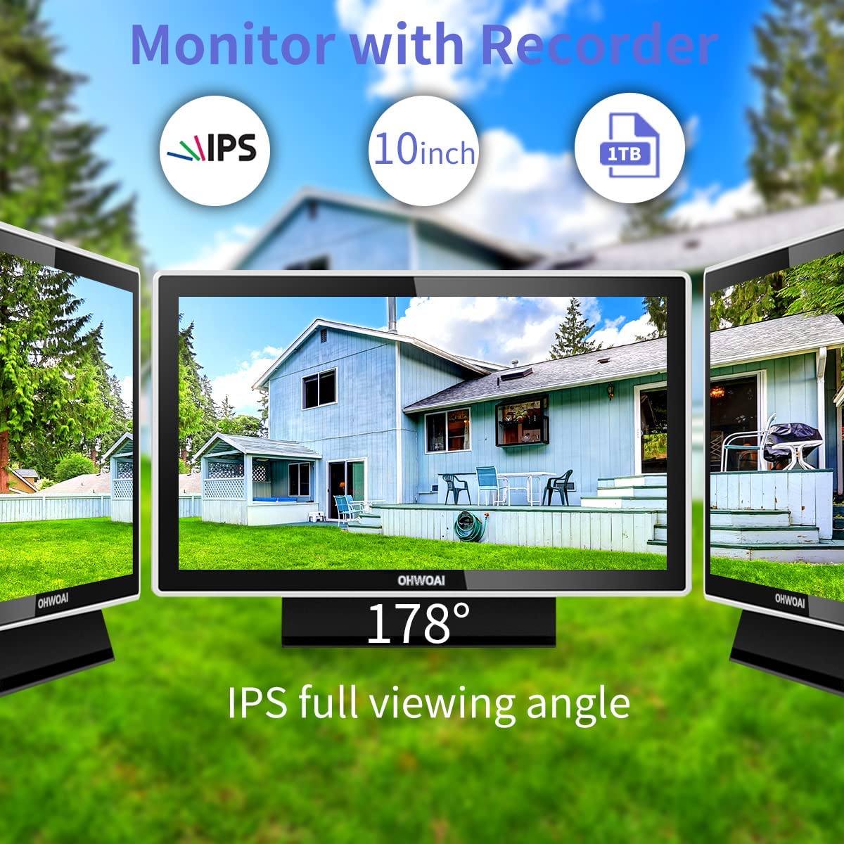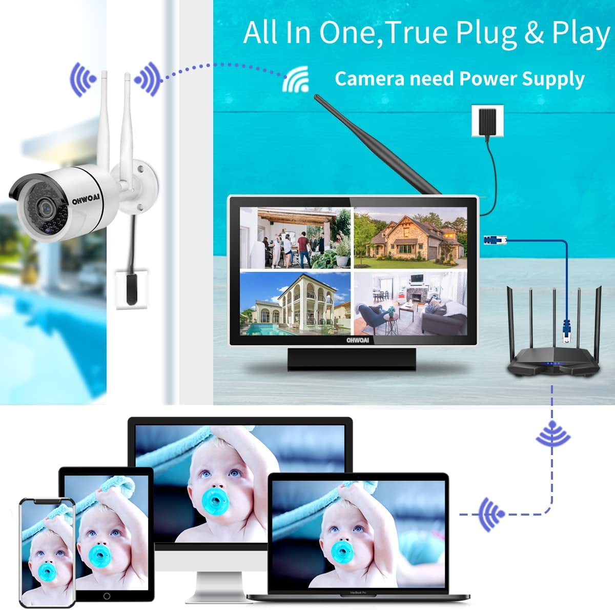 All -in-One System OHWOAI WIFI Security Camera System Equipped with 10” IPS Screen,Full HD Display Crisp Images and Allows Larger View Angle Up to 178° (Not cameras’ angle).This Wireless Security is Used for Villa,Home,Office,Shop,Warehouse or elsewhere Full HD 2K 3.0MP With the 2022 upgraded 3.0MP (2048 x1536) HD it can capture video at up to 60fps which is more detailed than 1080P HD. The built-in infrared LEDs provide 65ft of night vision in complete darkness. Dual-antenna provides stable wireless signals Dual-antenna design provides reliable and security connection between your wireless security camera and NVR receiver. The transmission distance of the dual antenna design can be increased by about 40%. AI Detection & E-mail Alert The system supports motion detection records and e-mail snapshot alerts etc. So any motion detection will be recorded, and E-mail alert will be sent immediately to your smart phone.And we can customize the scope of detection.Minimize detection area to minimize false alarms. Audio Camera The camera consist of no battery.Each camera needs to be plugged into a nearby outlet for power.Security Cameras with Audio either have a built-in microphone on the camera or an audio-input connector to connect an add-on microphone.No matter the mic is built-in or external, security camera microphones are sensitive enough to pickup sounds from a 40ft radius when in a quiet room. APP & Remote Viewing Download free app “Eseecloud” from App store on your smart phone. With the web, you can watch it remotely from any location, anywhere, on your phone(IOS&Android), PCs, or tablet.