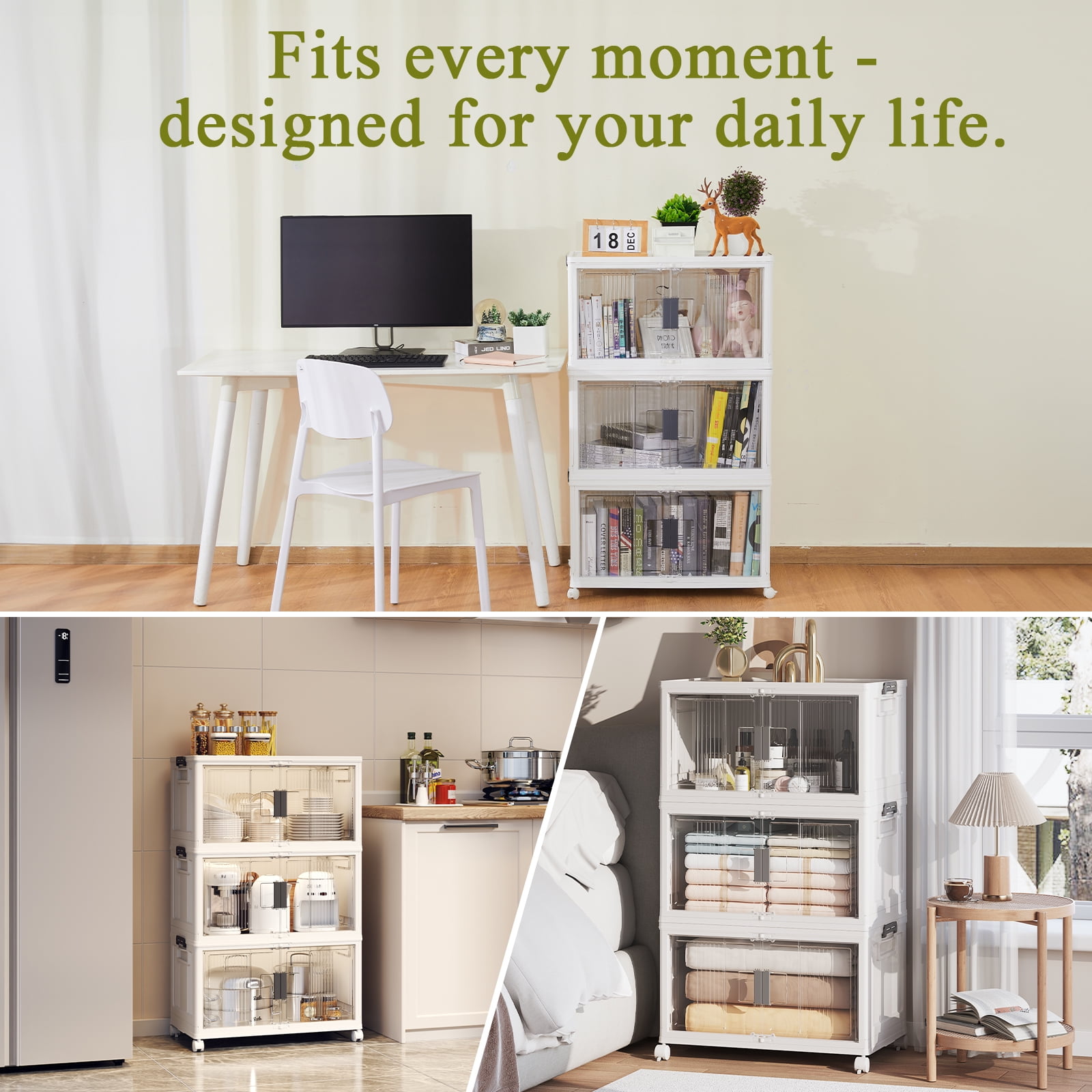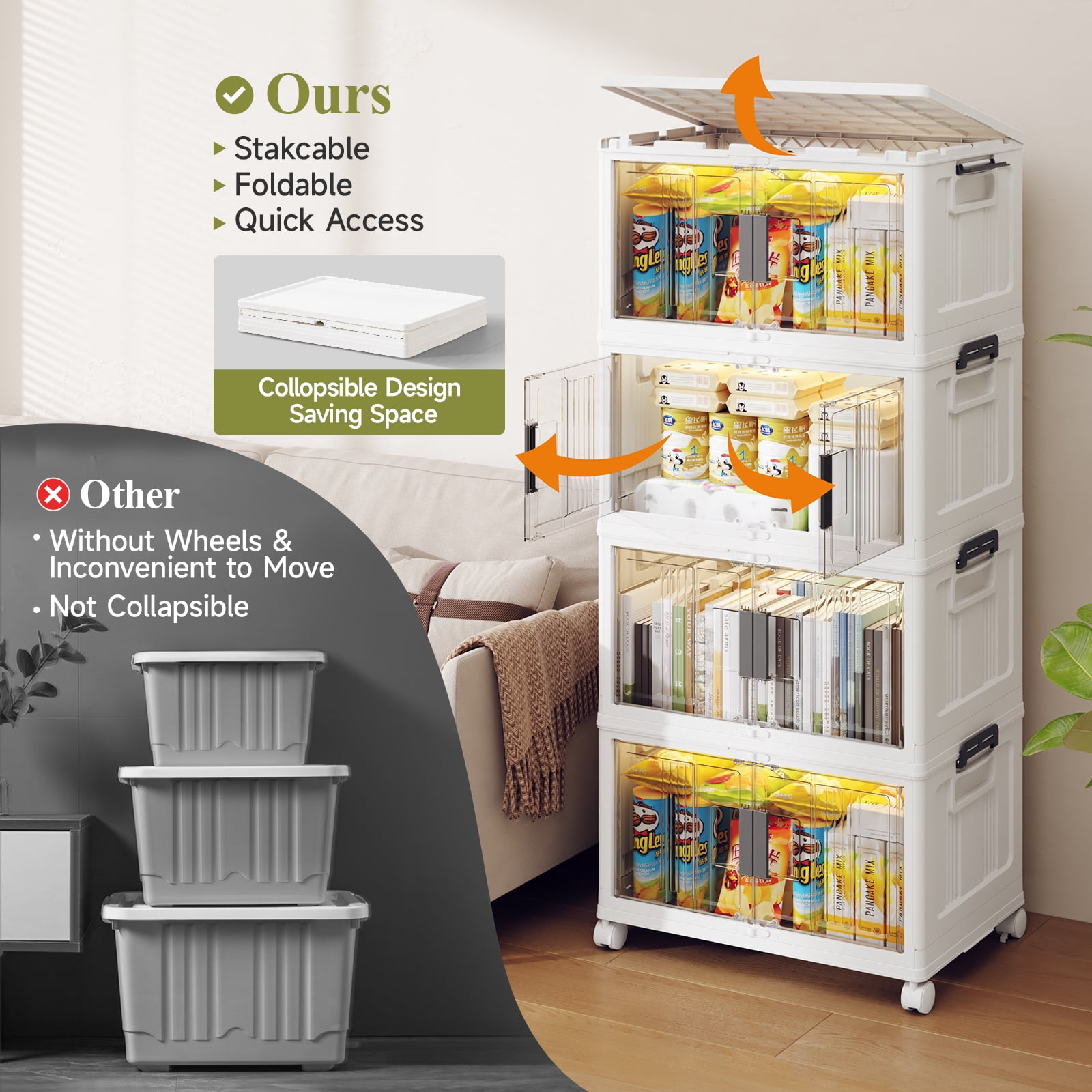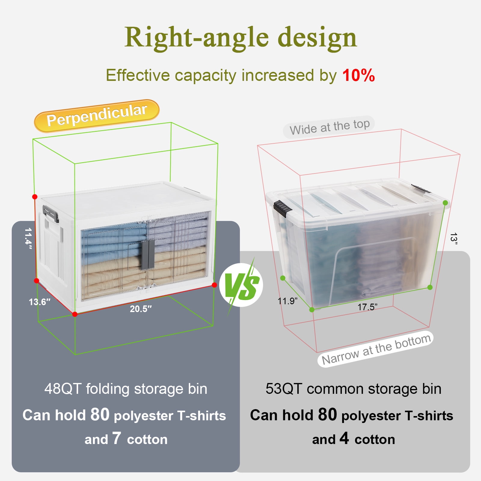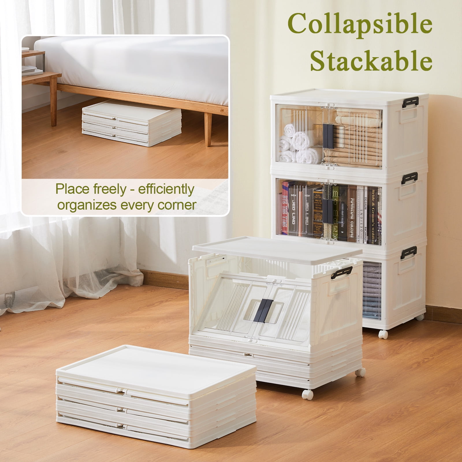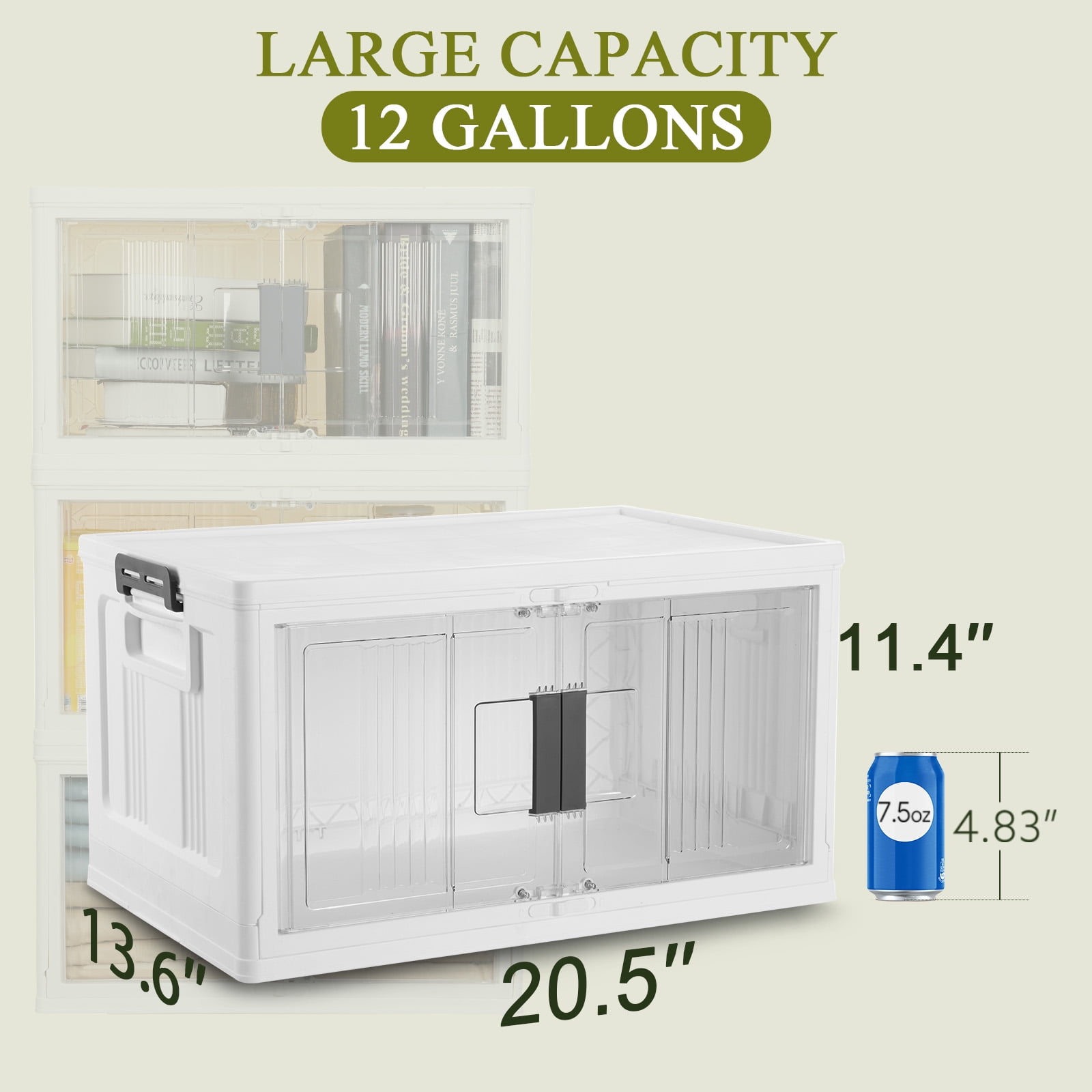 Multifunctional Use: These versatile storage bins are designed to accommodate a wide range of items, including clothing, bedding, books, snacks, and other miscellaneous items. They are also ideal for RV trips and camping adventures. Foldable, Stackable, and Mobile: Our storage containers can be easily folded in four simple steps when not in use, making them compact and storage-friendly in any space. Each bin features special grooves on the top and bottom for secure stacking and four rotating wheels for effortless mobility. Large Capacity: With dimensions of 20.5 inches (L) x 12 inches (W) x 12.12 inches (H) (3.12 inches when folded), these storage bins offer a spacious capacity of up to 48 quarts (12 gallons). They comfortably hold everyday items like cleaning supplies, snacks, office materials, and seasonal decorations. Their robust construction can support weights of up to 150 pounds (70KG), of weight, making them suitable for heavier items like books and tools. Easy-Access Doors: Our innovative design includes dual front doors, providing two convenient ways to access your belongings. Additionally, the top cover can be easily removed for quick access to larger items like clothing and blankets. High-Quality Materials: Crafted from high-impact, shatter-resistant Polypropylene plastic (PP) material, each storage bin ensures exceptional durability and protection for your belongings, whether at home or on the go.