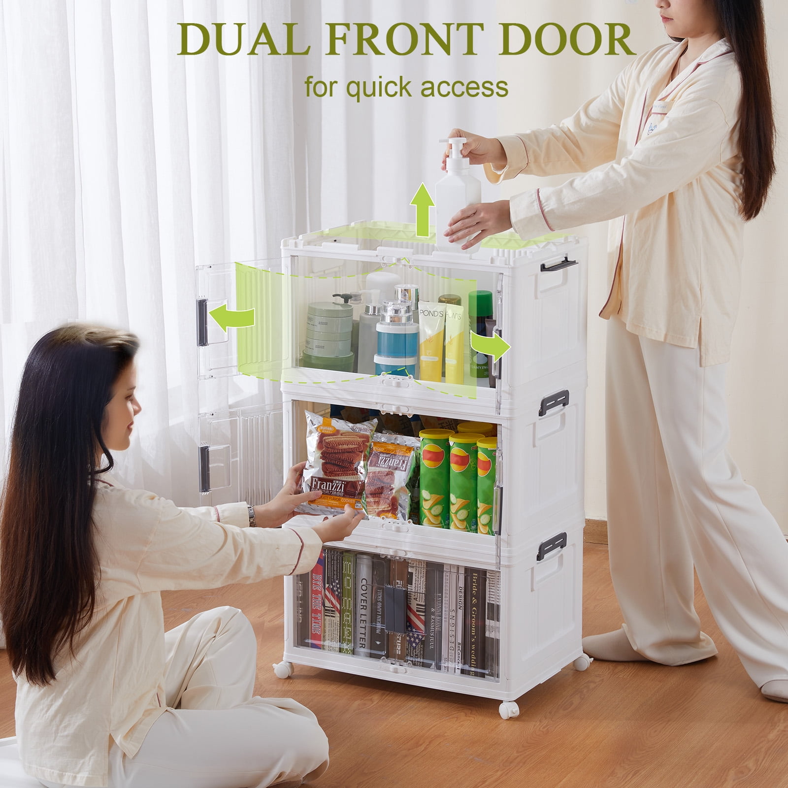 Ophanie 144QT Collapsible Wheeled Stackable Plastic Storage Bins with Lid and Doors, Large Closet Organizers and Containers, Plastic Totes With Lids For Storage, 3-Pack, White