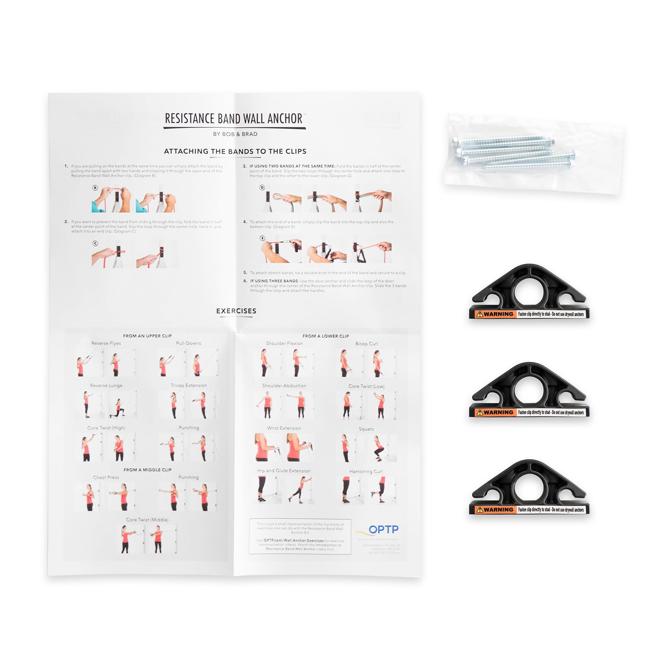 Versatile Resistance Band Wall Anchor Kit: Attach resistance bands or tubes for resistance training exercises. Allows for a variety of angles and exercises and a full body workout Highly Compatible with Resistance Training Accessories: Each anchor is compatible with resistance bands, tubes or pulleys at three different attachment points Sturdy, Durable Resistance Band Wall Mount System: Each of the three included clips can accommodate a pull force of 800 pounds, allowing for lower, middle and upper wall attachment positions Resistance Band Anchors are Ideal for: At home resistance training, general fitness, cardio, core strengthening, physical therapy, prehab, stretching and more From Bob & Brad, All-In-One-Kit: These wall anchors for resistance bands were designed by physical therapists Bob Schrupp and Brad Heineck. The kit contains three wall clips, exercise poster, online exercise videos, screw for installation, and instructions for permanently installing into wall stud