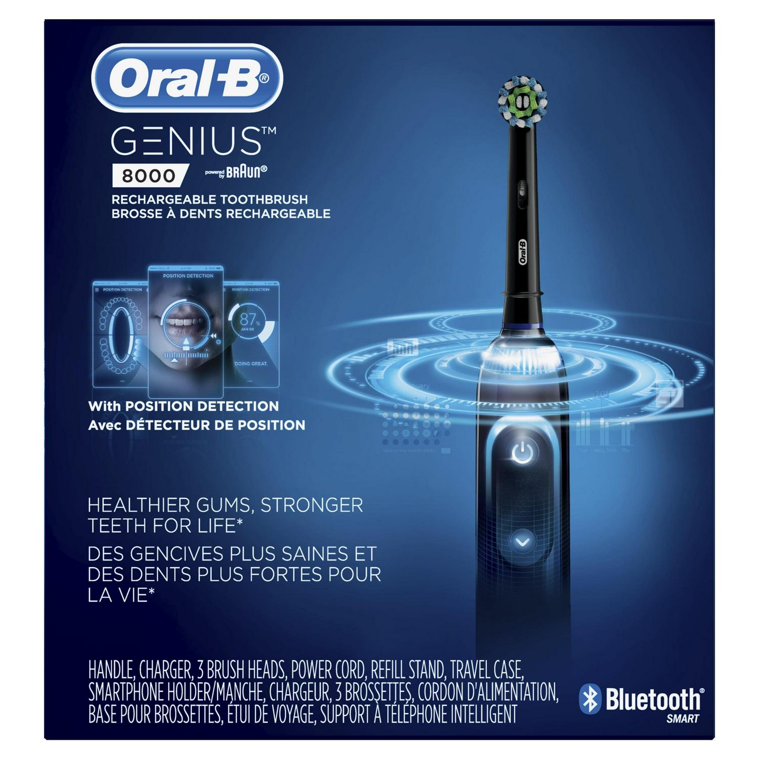 Use the Oral-B App to seamlessly pair your Genius 8000 with a smartphone and you’re on your way to brushing like your dentist recommends. The Oral-B Genius 8000 comes with Position Detection technology which uses Bluetooth technology, your smartphone, and facial recognition technology to provide you with real-time feedback about your brushing habits. The 360 SmartRing with LED lights allows you to personalize your brushing experience with your choice of 12 colors. The SmartRing works with the integrated timer and pressure sensor to provide you with visual feedback on brushing time and brushing pressure. Together, they help you ensure you brush for the recommended 2-minutes while making sure you brush with appropriate pressure to protect your gums from over-brushing. The premium Smart Travel Case lets you charge your brush and smartphone (via USB) at the same time while using only one wall plug. The Genius features 6 brushing modes so you can further customize your brushing experience based on your specific oral care goals. This highly advanced brush features a dentist-inspired round head that surrounds and cups each tooth with dynamic oscillating, rotating and pulsating movements to remove up to 500% more plaque than a regular manual toothbrush. Trust in the precision engineering of Braun and the dental expertise of Oral-B, the #1 brand used and recommended by dentists worldwide. 100% Satisfaction Guaranteed. Manufacturer Contact Information Customer support : (800) 566-7252 or (800) 566-ORALB