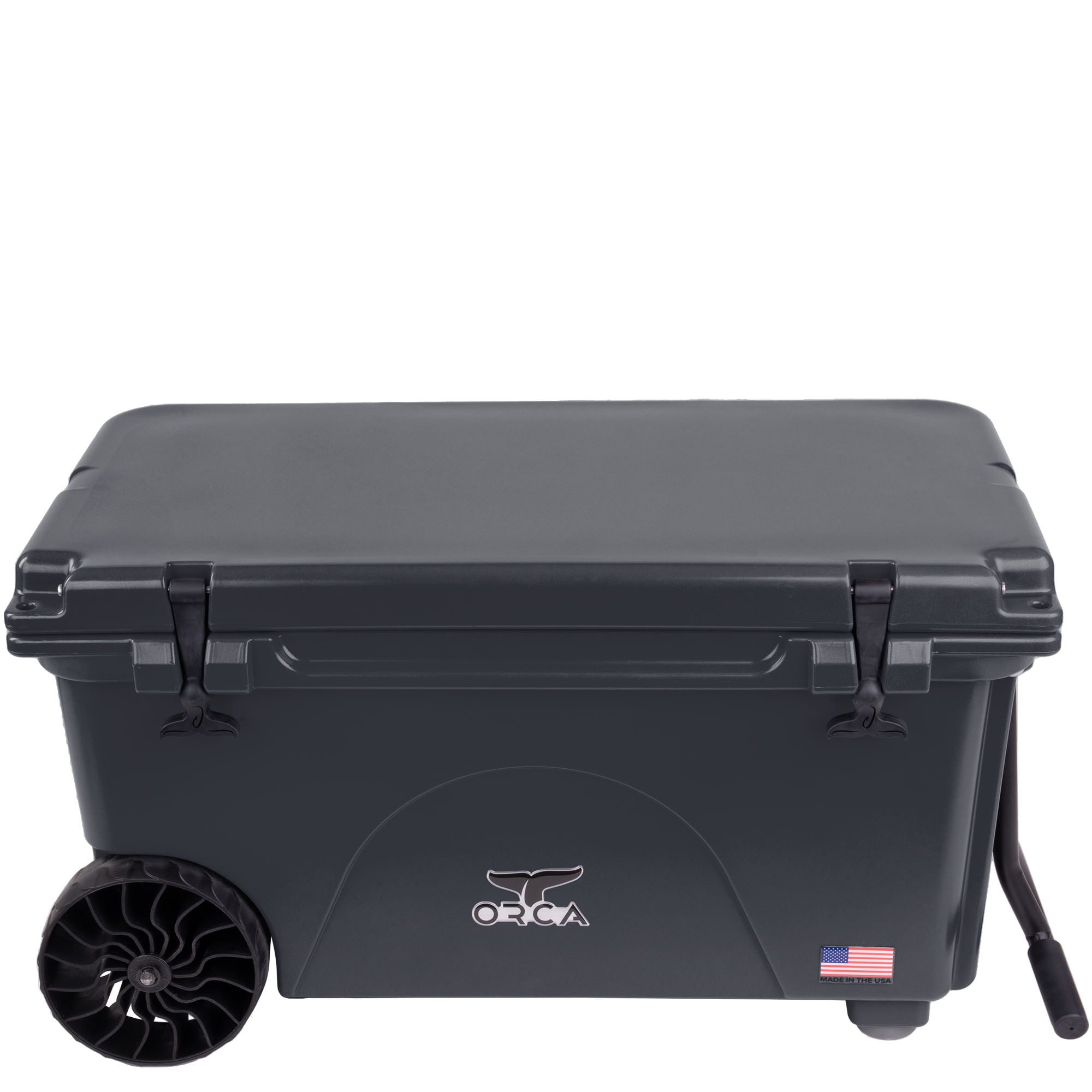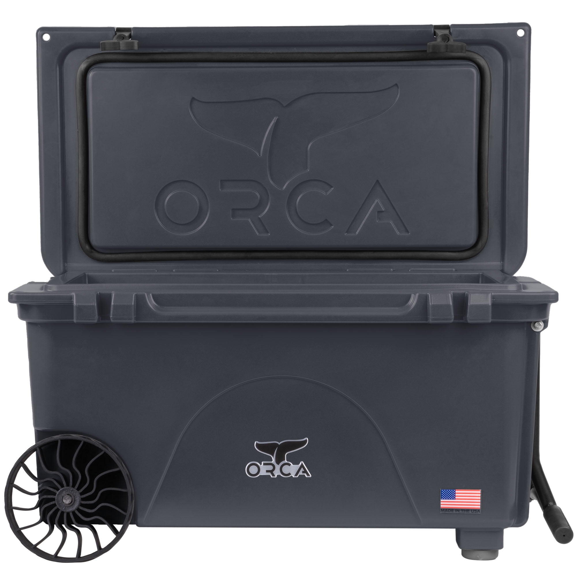 ORCA 65 Quart Wheeled Hard Cooler Insulated Ice Chest, Charcoal Gray p to 54 can capacity Durable, roto-molded construction Integrated insulation for maximum ice/cold retention and freshness of your stowed items for up to 8 days Large diameter all-terrain wheels Extendable comfort-grip handle for towing Cargo net attachment for added storage Molded drain channel for quicker draining Interagency Grizzly Bear Committee (IGBC) certified bear-resistant Divider slots for organizing and separating items (optional dividers sold separately)