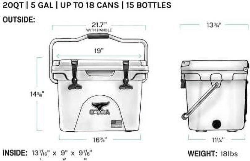– 20-quart storage capacity.- Durable, roto-molded construction.- Integrated insulation for maximum ice/cold retention and freshness of your stowed items for up to 10 days.- Lid gasket to ensure a perfect seal.- Single flex-grip stainless steel handle for simple solo portage.- Cargo net attachment for added storage.- Easy-flow drainage spout.- Dimensions (WHD): 19 x 13 3/4 x 11 1/4