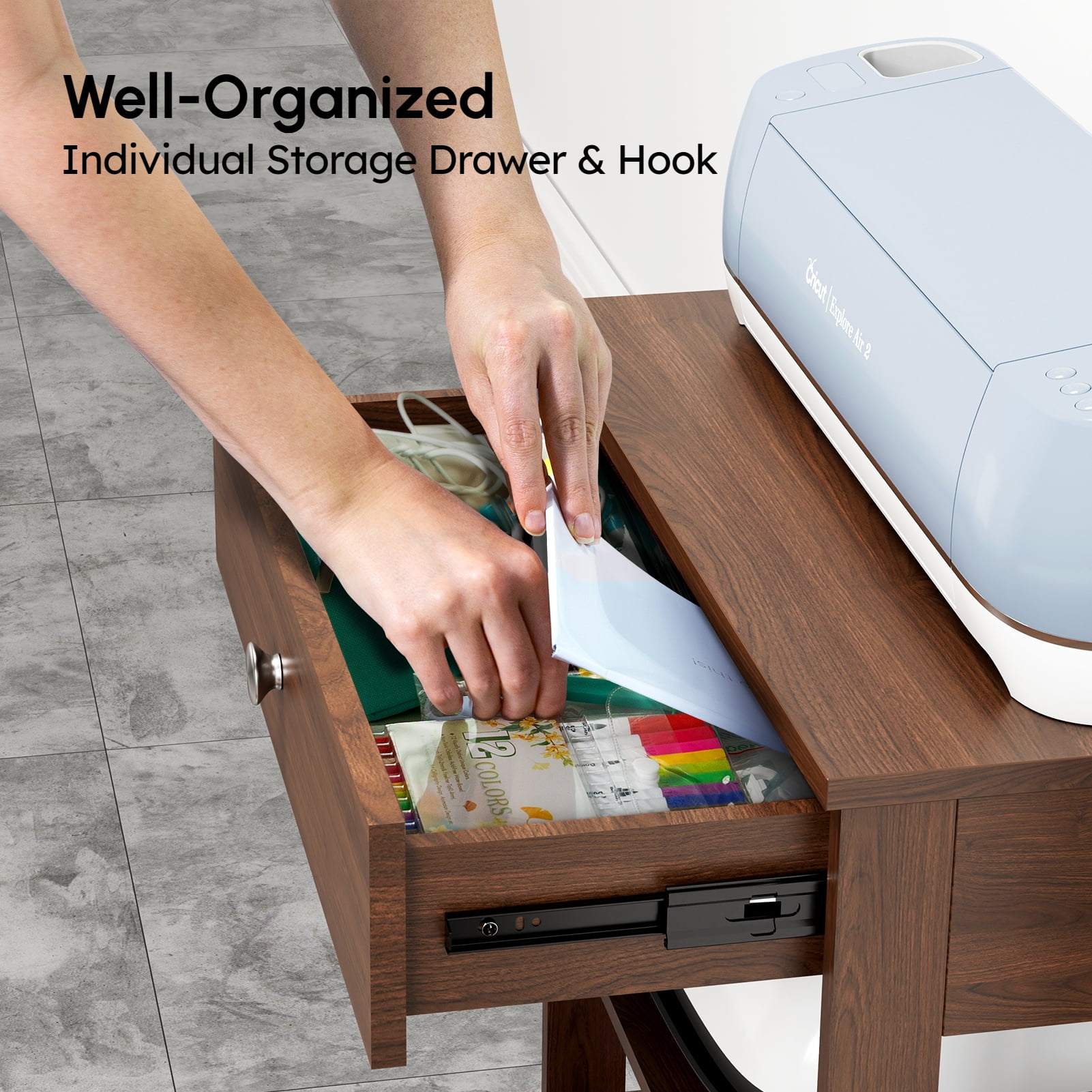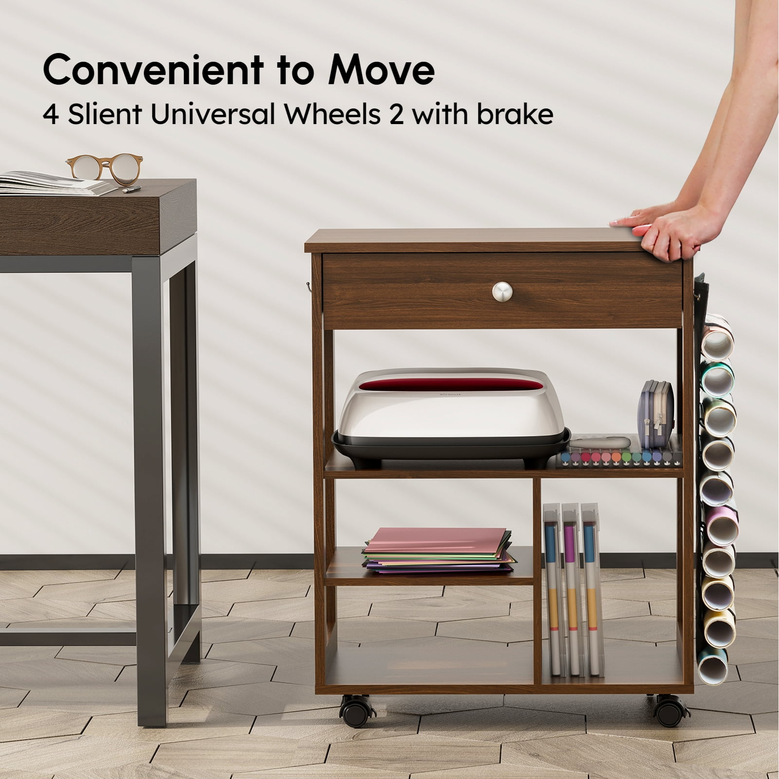 From cutting machines, vinyl rolls and 12 x 12 inch card stock papers to all kinds of tools, this organizer has a designated space for everything! The top and middle shelves compatible with all Cricut machines, the drawer stores various tools, left side hook hangs cutting mats, right side vinyl roll organizer holds up to 10 vinyl rolls, and other shelves at your disposal