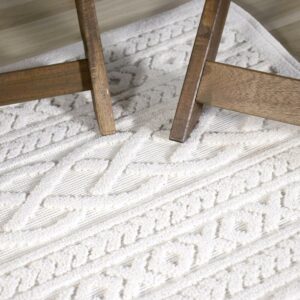 Instantly brighten any room with the Boucle Jenna Area Rug. This rug showcases crisp colors, an intricate braided pattern, and satisfying high-low texture. This rug is stain and fade resistant and easily cleaned for style virtually anywhere!