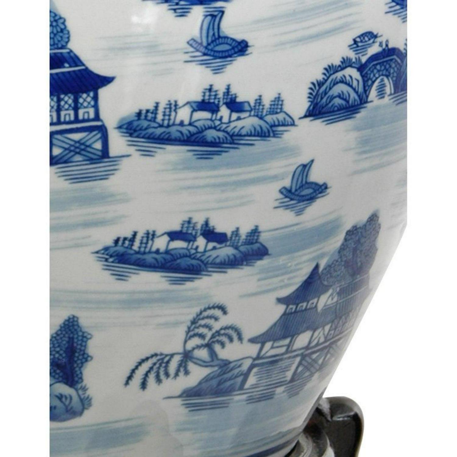 - Hand-applied oriental landscape pattern in classic Ming blue and white
