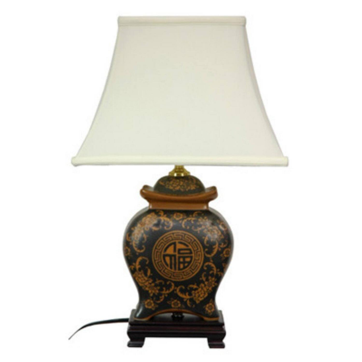 Inspired by classic Song Dynasty designs, the Oriental Furniture 19 Inch Porcelain Lamp combines a distinctive silhouette and bold shades of black and copper. Stylized characters and ornate botanical motifs make this an ideal choice for Asian-style and traditional interiors. Handcrafted by skilled artisans in China’s Guangdong province, the porcelain vase features a richly textured glaze. It rests upon a carved wooden base with deep and rich Rosewood finish. A square, flared ivory silk fabric shade on a steel frame completes the look. This remarkable table lamp stands 19 inches tall and utilizes a convenient three-way light fixture. It requires a single three-way 100-watt, medium-base bulb, which is not included. Oriental Furniture What began in 1985 as a simple retail store in Natick, Mass., has now blossomed into Oriental Furniture, one of the largest online retailers of furniture, gifts, and accessories
