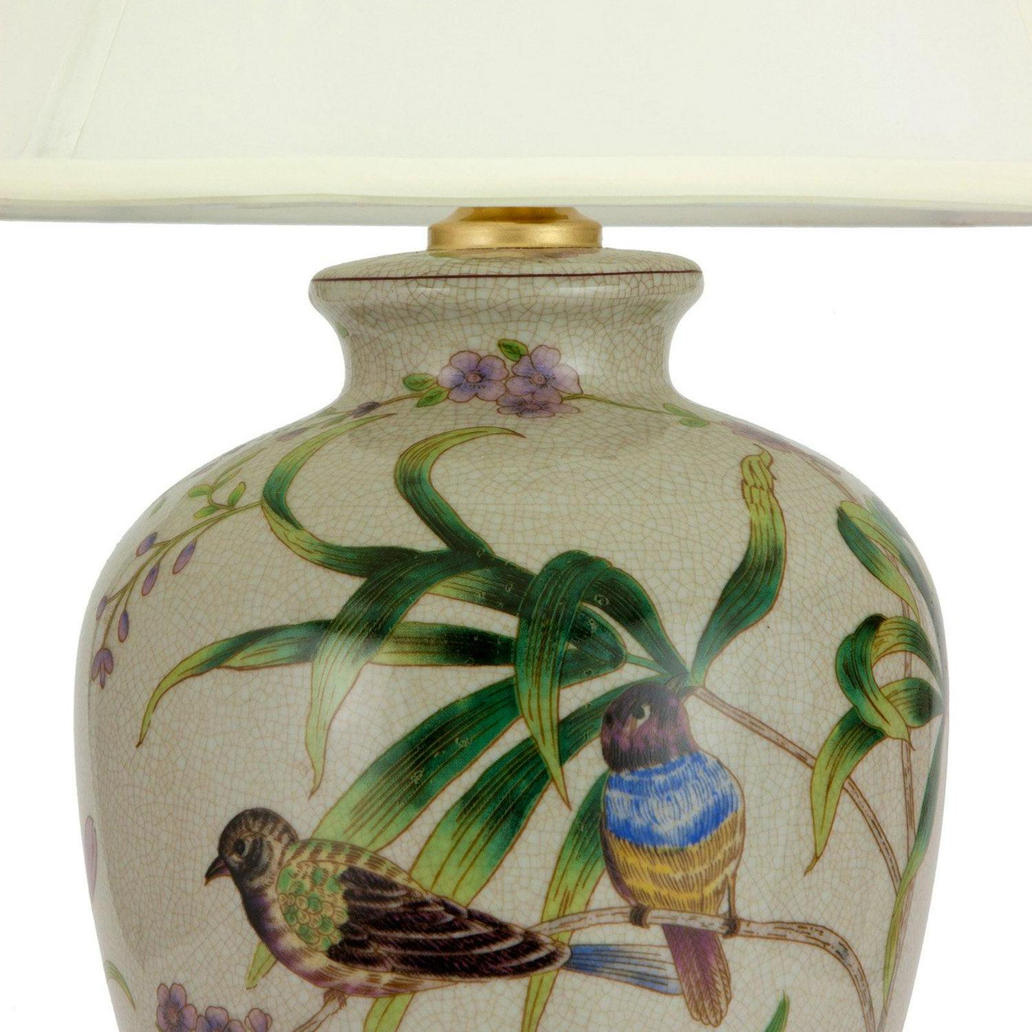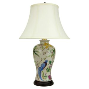 This colorful lamp features a beautiful design perfect for anyone who loves tropical scenery or eclectic decor styles. The body of the lamp is coated in a medium gloss glaze and depicts brightly-hued songbirds nestling in breezy palm branches among exotic flowers. This lamp will bring a balmy tropical accent to any room of the house all year round.