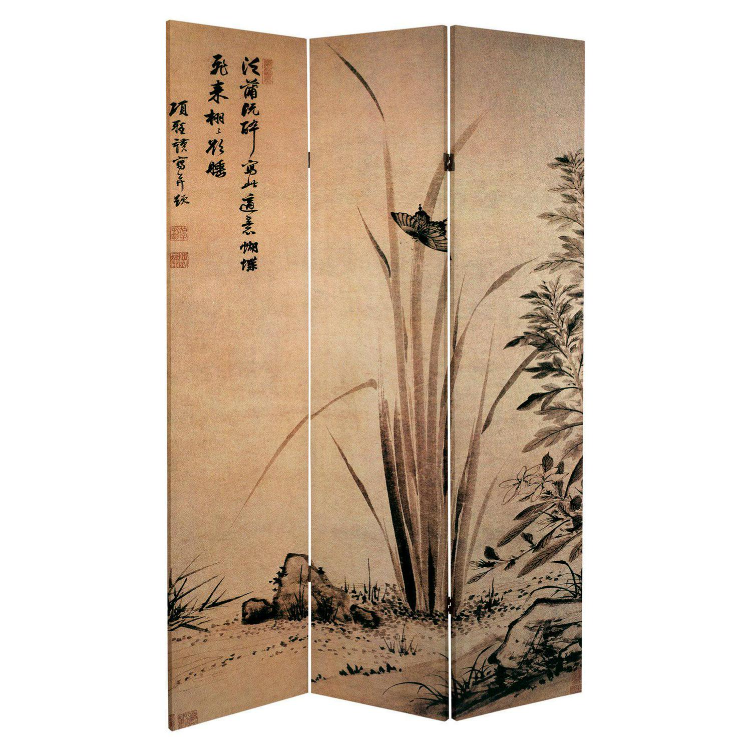 Bring home the mystique of the far east with this versatile room divider from our series of turn of the century, Japanese art reproduction screens. The front is from a silk screen painting, with a small plant being pollinated by a butterfly. On the back is a stylized rendering of tall cranes, originally painted on a gold leaf background. Add a splash of historical Asian artwork to your living room, bedroom, dining room, or kitchen. This three panel screen has different images on each side, as shown.