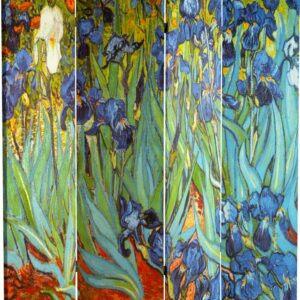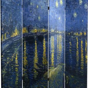 This lovely fine art screen features the classic impressionist paintings of Dutch master Vincent Van Gogh. The front is considered to be one of Van Gogh’s greatest masterpieces, Irises circa 1889, part of the Getty collection. On the back is a less well known but equally breathtaking painting, Starry Night Over the Rhone circa 1888, similar to his legendary Starry Night. Adorn your living room, bedroom, dining room, home office, or business with these lovely interior design elements. This four panel screen has different images on each side, as shown.