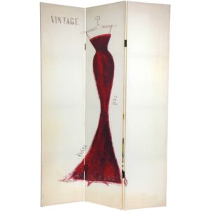 This unique screen is adorned with vintage graphic art. On one side is a 1920’s Paris, France travel poster; the other is an eye catching impressionist style drawing of a dark red evening gown. Simple, subtle, attractive imagery and rich colors make this screen a beautiful decorative accent for any room: living room, bedroom, dining or kitchen. A wonderful burst of color and shape that lifts the spirits of the space and the occupants. Each side has a different image as shown.