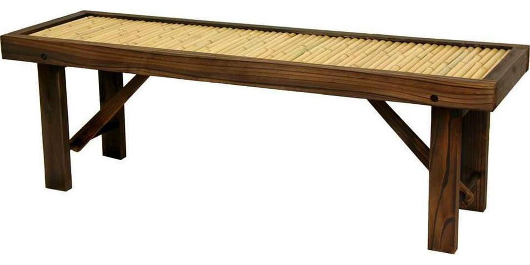 Flat Japanese bamboo bench with dark walnut wood. Kiln-dried frame has sturdy block legs and extra center beam for added support and durability. Seat consists of authentic bleached bamboo poles. Recommended storage during harsh weather to maximize product lifespan if using outdoors. Lightweight bench adds a practical and appealing Oriental accent to your garden, porch, hallway or other room in the house or office.