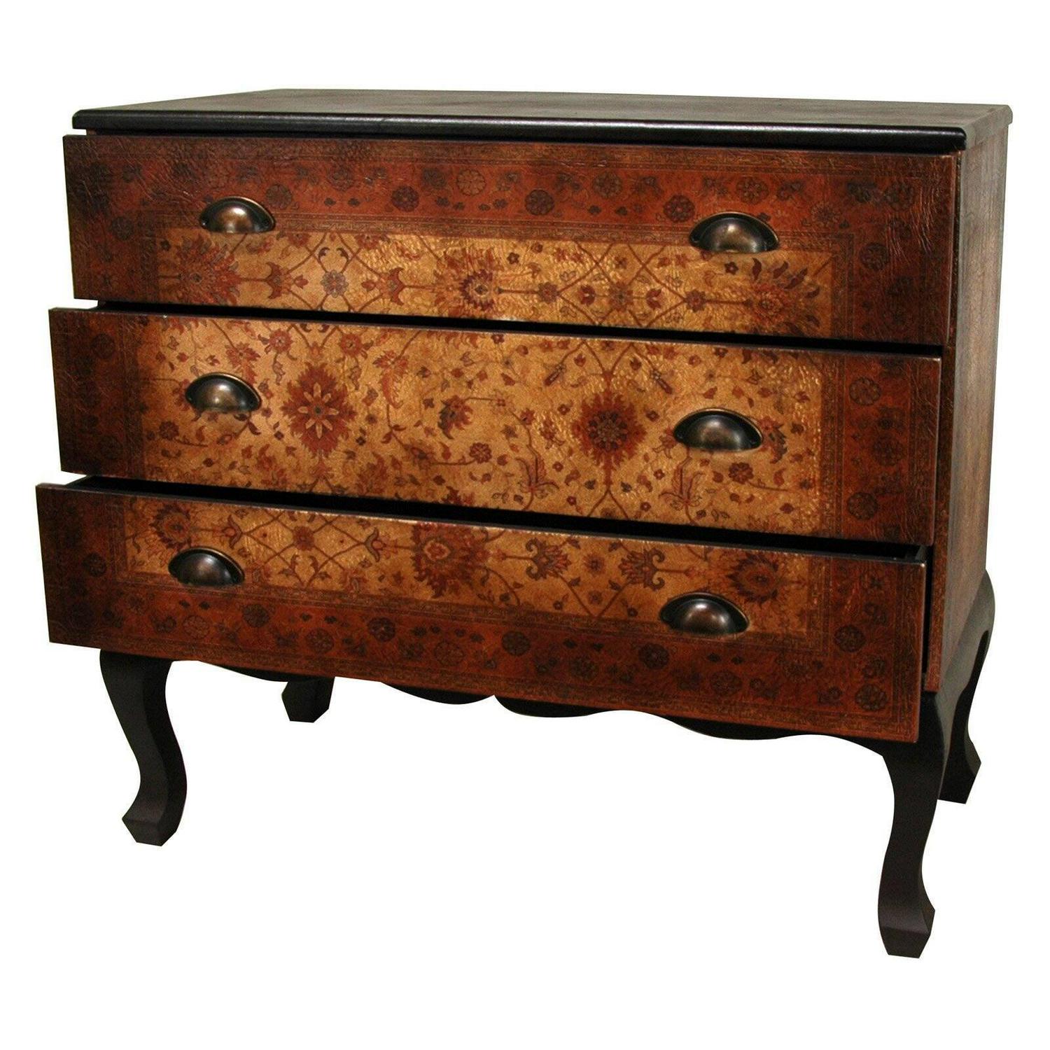 A simple, beautifully designed and proportioned three drawer chest, with elegant Queen Ann style carved legs and apron, complimenting the lovely, European design faux leather finish. The drawer fronts are decorated with subtle, muted colors in an attractive old world design, attractively accented by unique, distinctive drawer pulls. The size and shape as well as the elegant finish have made this a particularly popular design. A great hall chest, a small server, a large end table or night stand or a lovely accent cabinet in a living or family room.