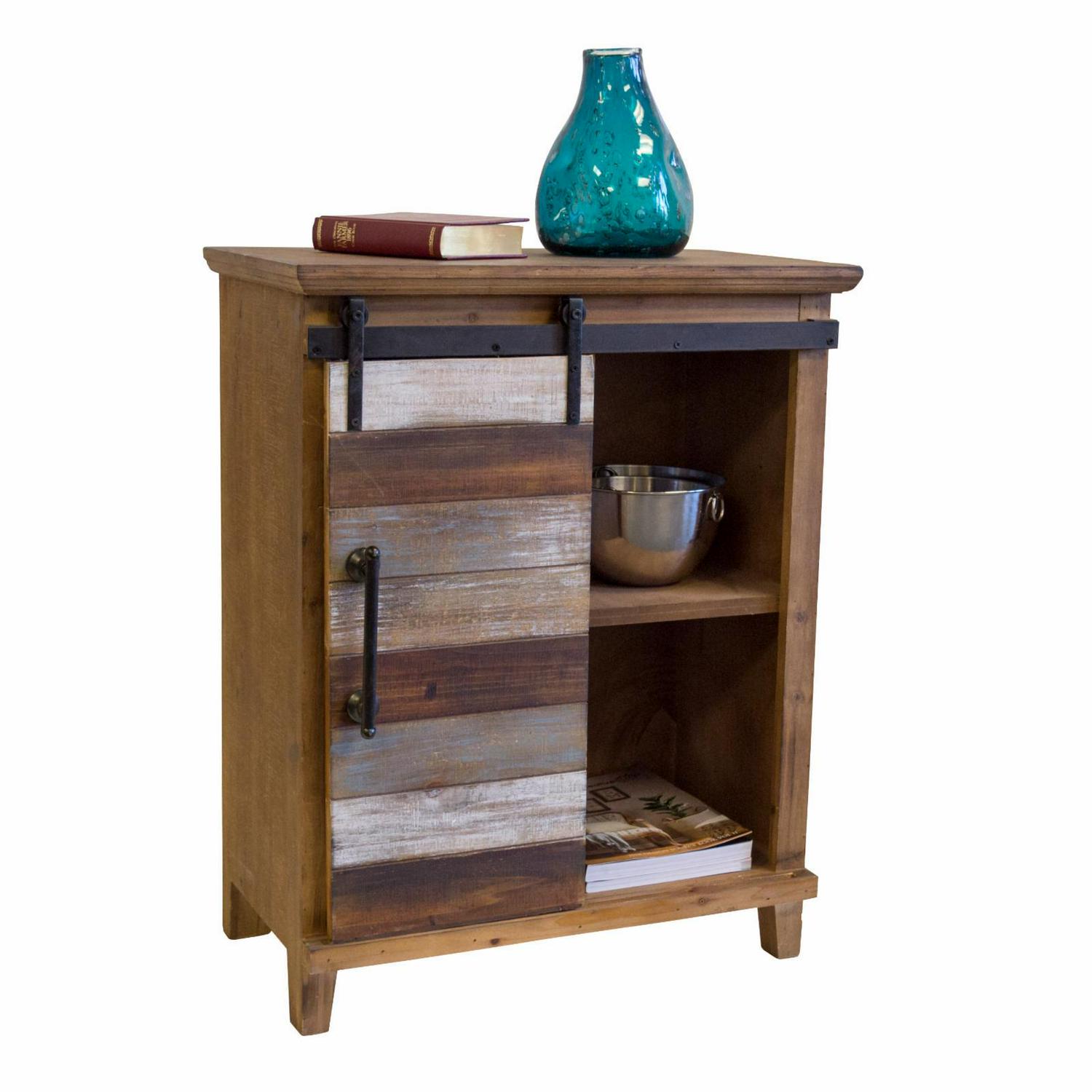This is a great accent storage item for you kitchen or family room. Features a fashionable barn style sliding door on sturdy metal wheels, four drawer bins and two shelves. Solid wood with multiple distressed finishes. Four sturdy drawer bins. Two shelves hidden behind barn door.