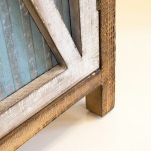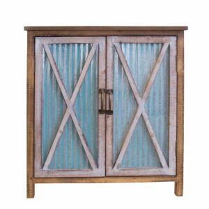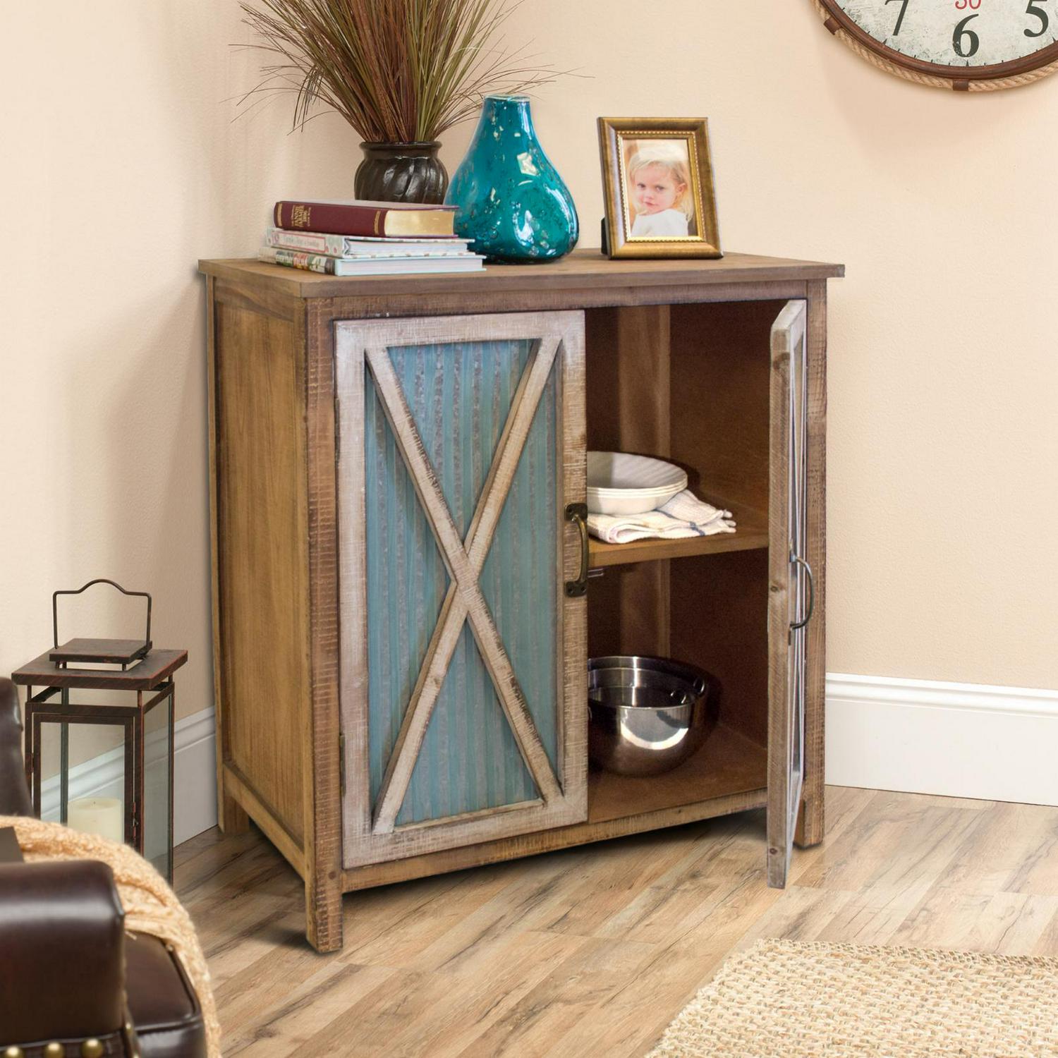 Bring a country, farm style to your home with this very functional storage accent cabinet. The two doors feature framed antique white solid wood rails matched with weathered corrugated metal. The doors have a magnetic catch and hide two spacious solid wood shelves.