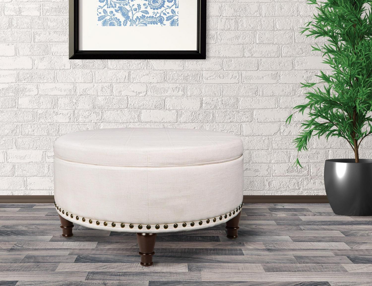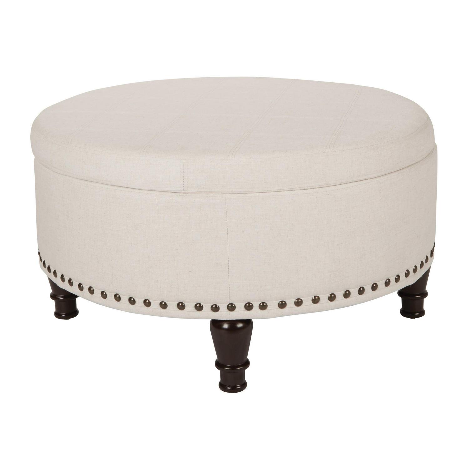 OSP Home Furnishings Augusta Round Storage Ottoman in Linen Fabric with decorative nailheads