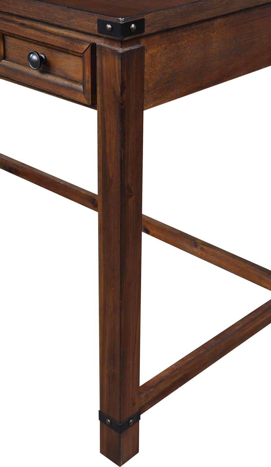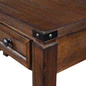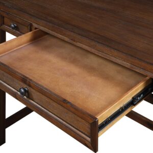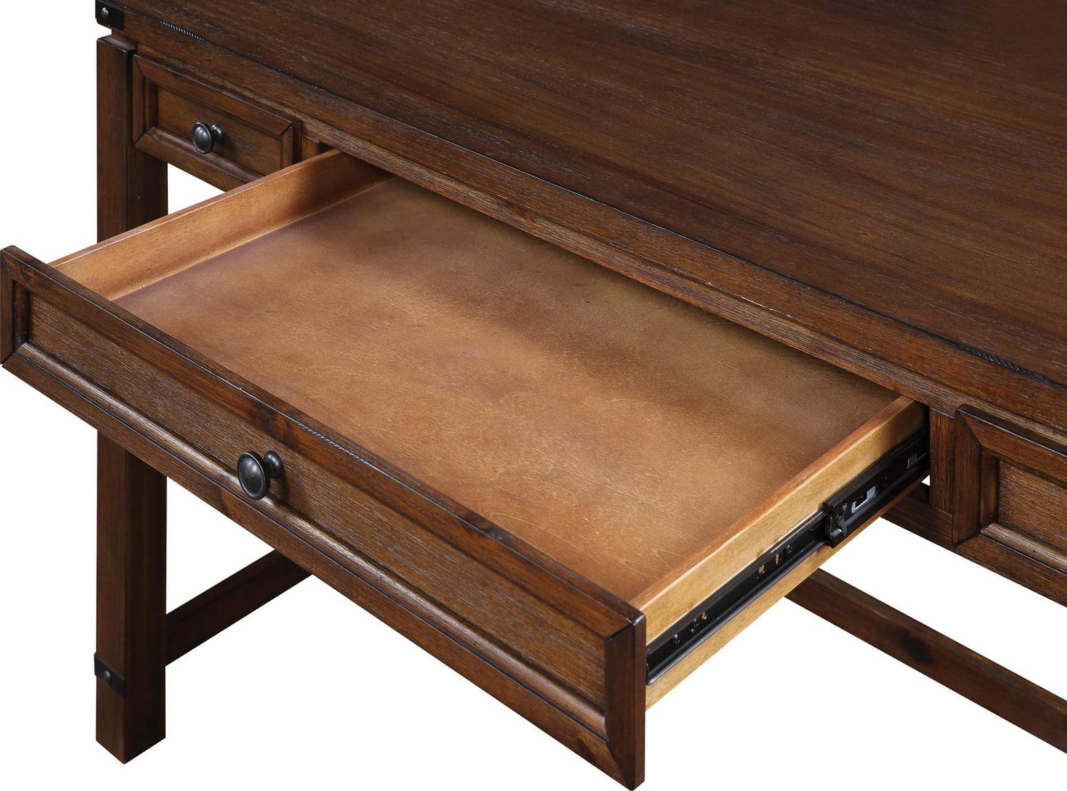 Traditional design with rustic industrial touches; Decorative hardware includes metal corner brackets and drawer pulls in burnished black; Classic Walnut Finish with wire brushed texture décor; Easy 8 bolt assembly; Sturdy full post construction; Handy drawers feature full extension drawer slides; Beautiful floating top design and panel framed drawer fronts; Assembled dimensions: 48 wide x 24 deep x 30 tall