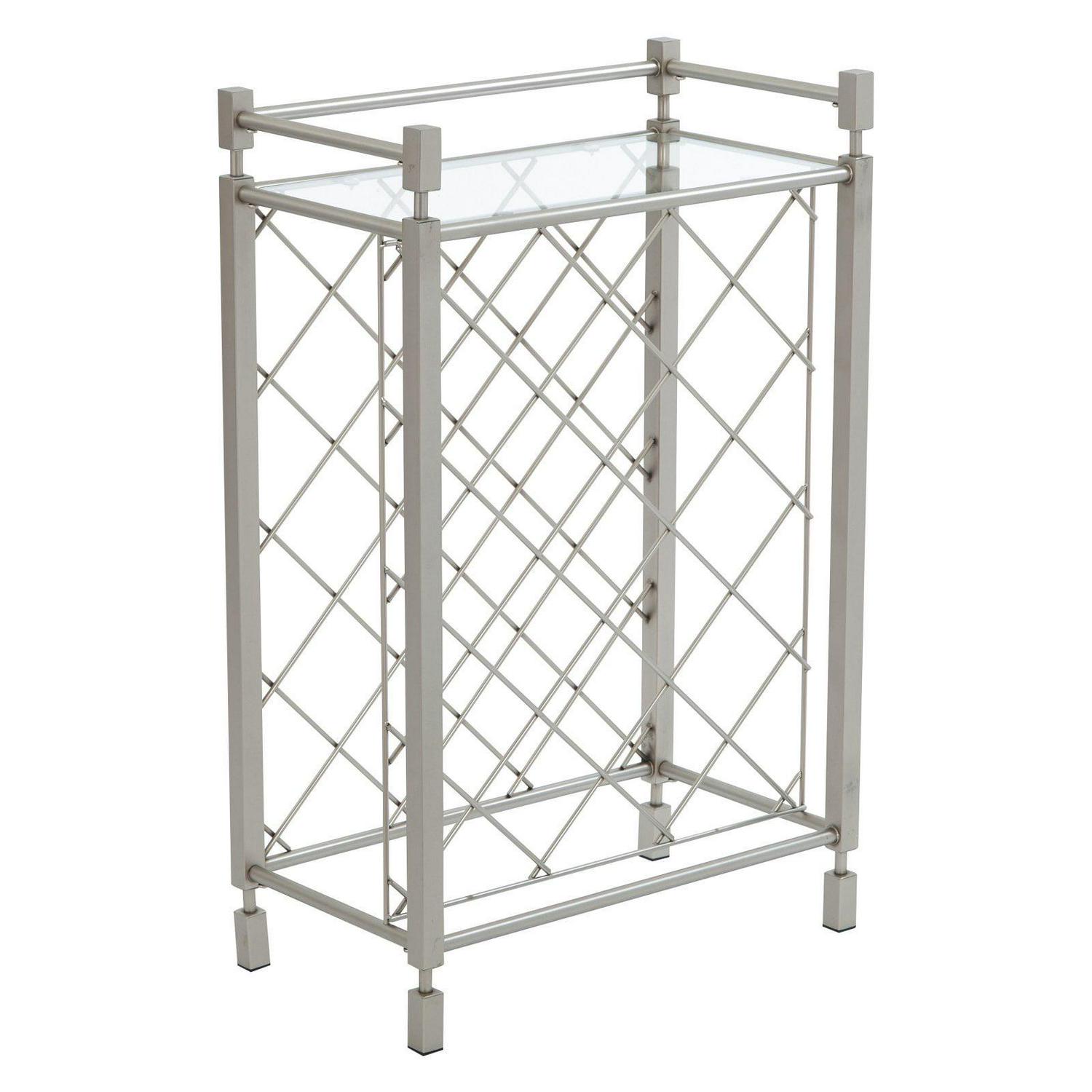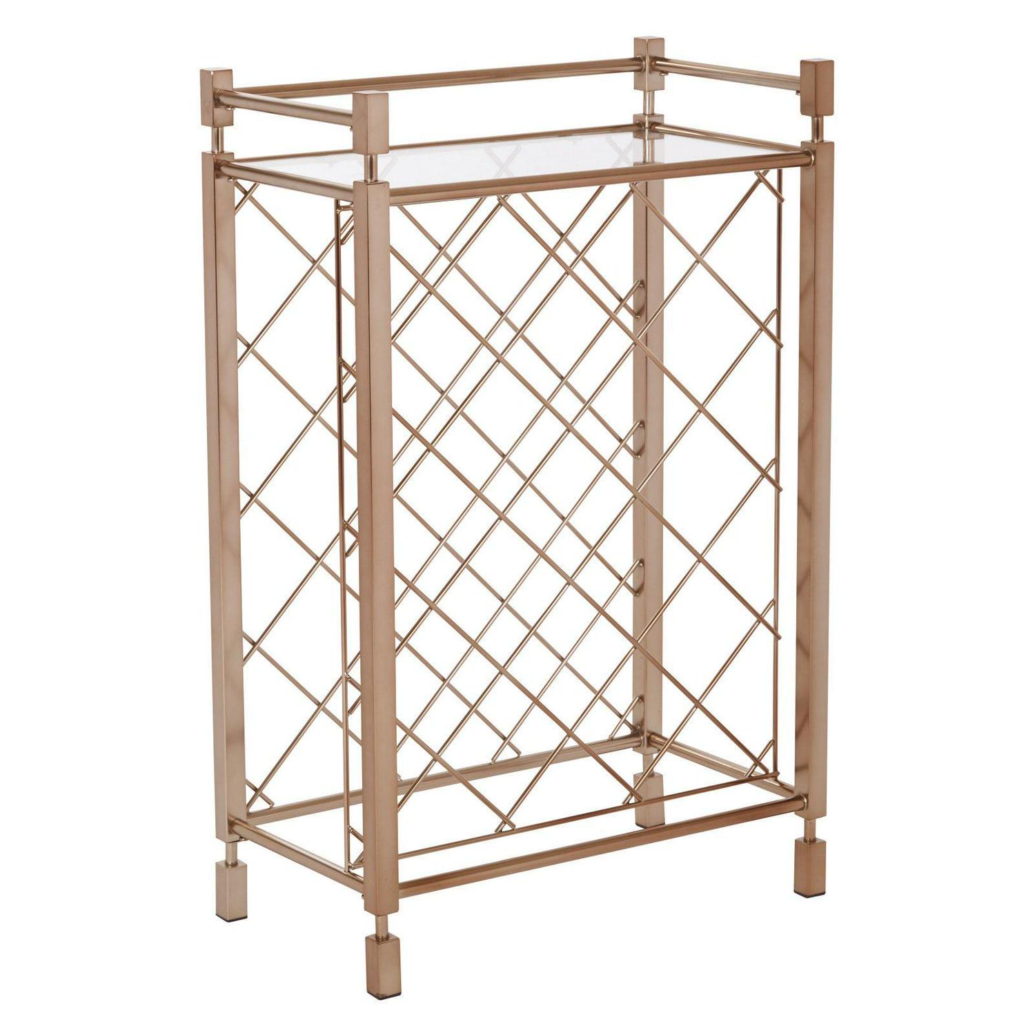 A touch of glam. An elegant addition to the home, this wine table is a sophisticated way to store and serve your wine. The tempered glass top is perfect for pouring wine for your guests, while the crisscross pattern design allows for storage of up to 17 bottles so you can keep all of your favorites close at hand when entertaining. Showcase your wine collection with the Covina wine rack by OSP Designs.