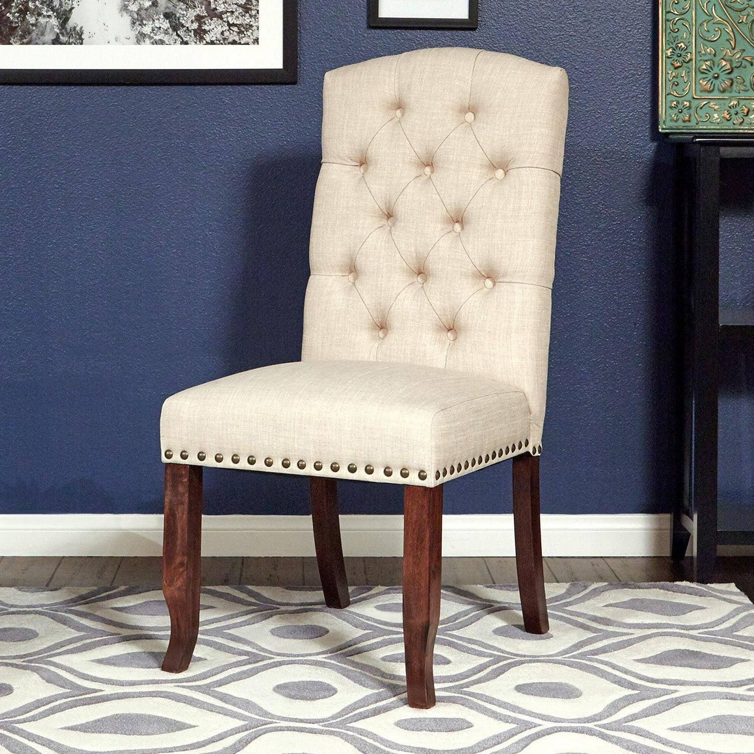 Elegantly sophisticated you ll be all set to host your first dinner party with these classic dining chairs. The timeless elegance of the 12 button tufted back and nail-head trim exudes modern sophistication, while the dark, solid wood legs provide long lasting durability and support. Dress up your dining room with the Jessica tufted dining chair by Avenue Six.