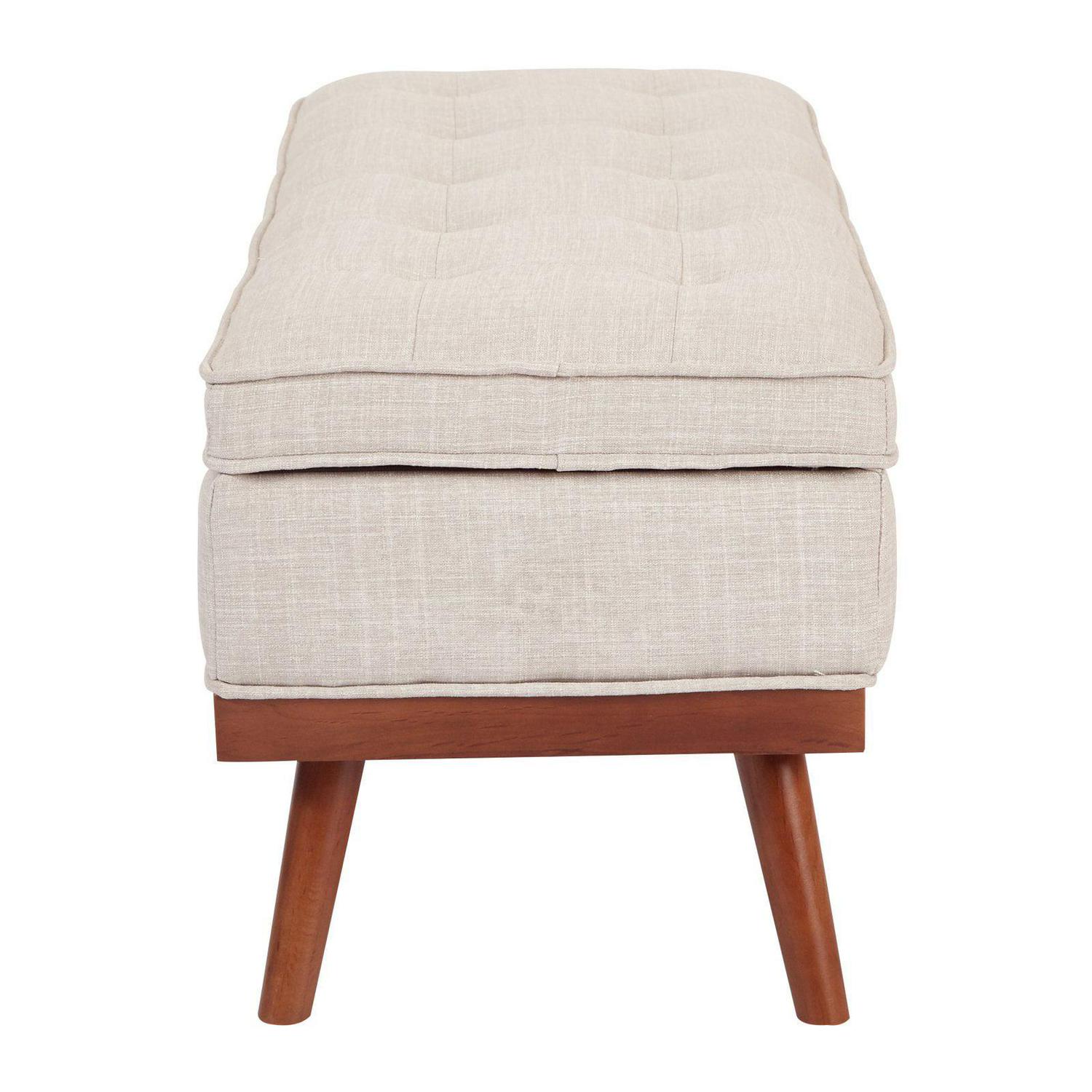 Update your entry with a Mid-Century Modern statement piece that doubles as extra home storage. This plush, button tufted storage bench sets the mood as guests enter your home and offers a spot for purses, backpacks or shoes. Place in front of a sofa for a soft place the kick your feet up while storing all your blanket throws. Modern, tapered, solid wood legs provide stability, while the soft-close hinged top allows for easy access to the fully lined storage space. Complete your home style with the Katheryn storage bench.