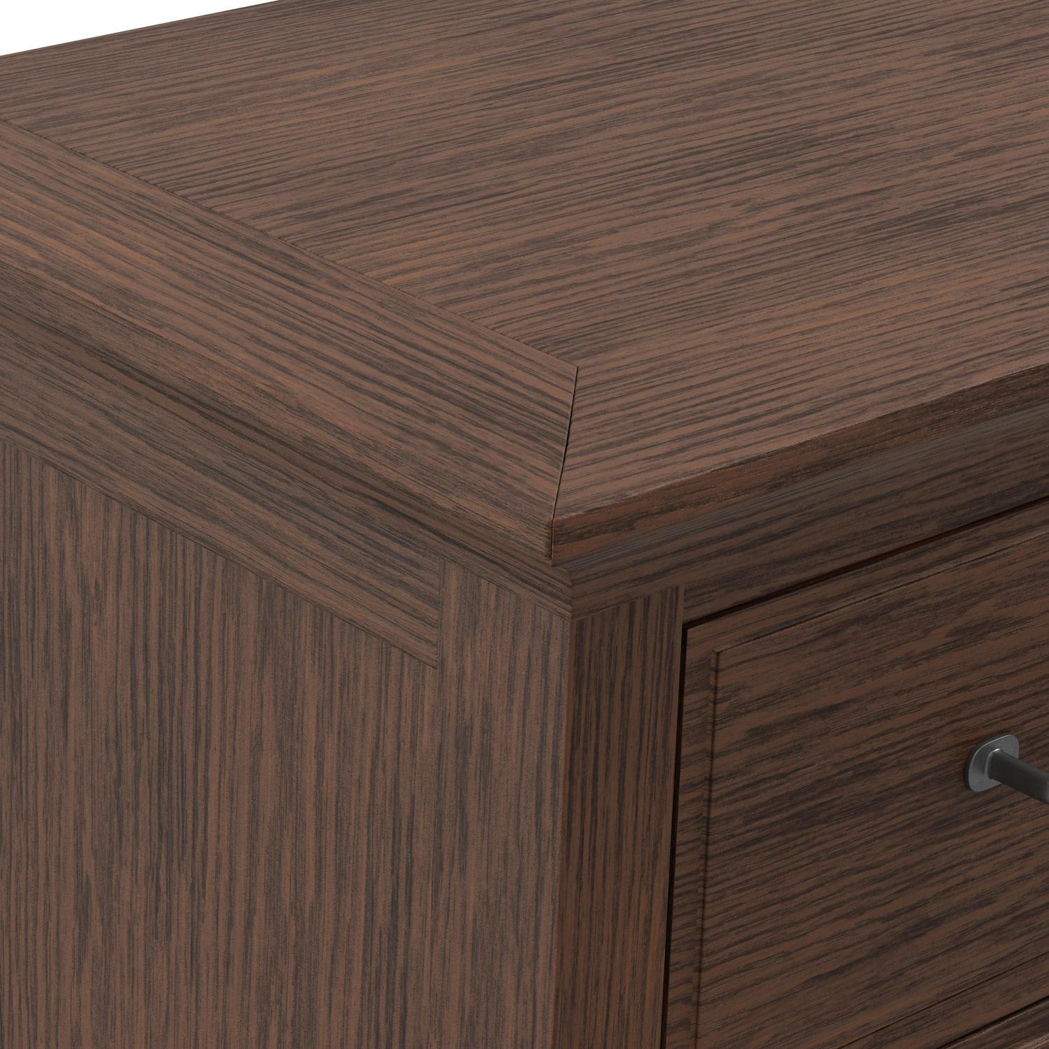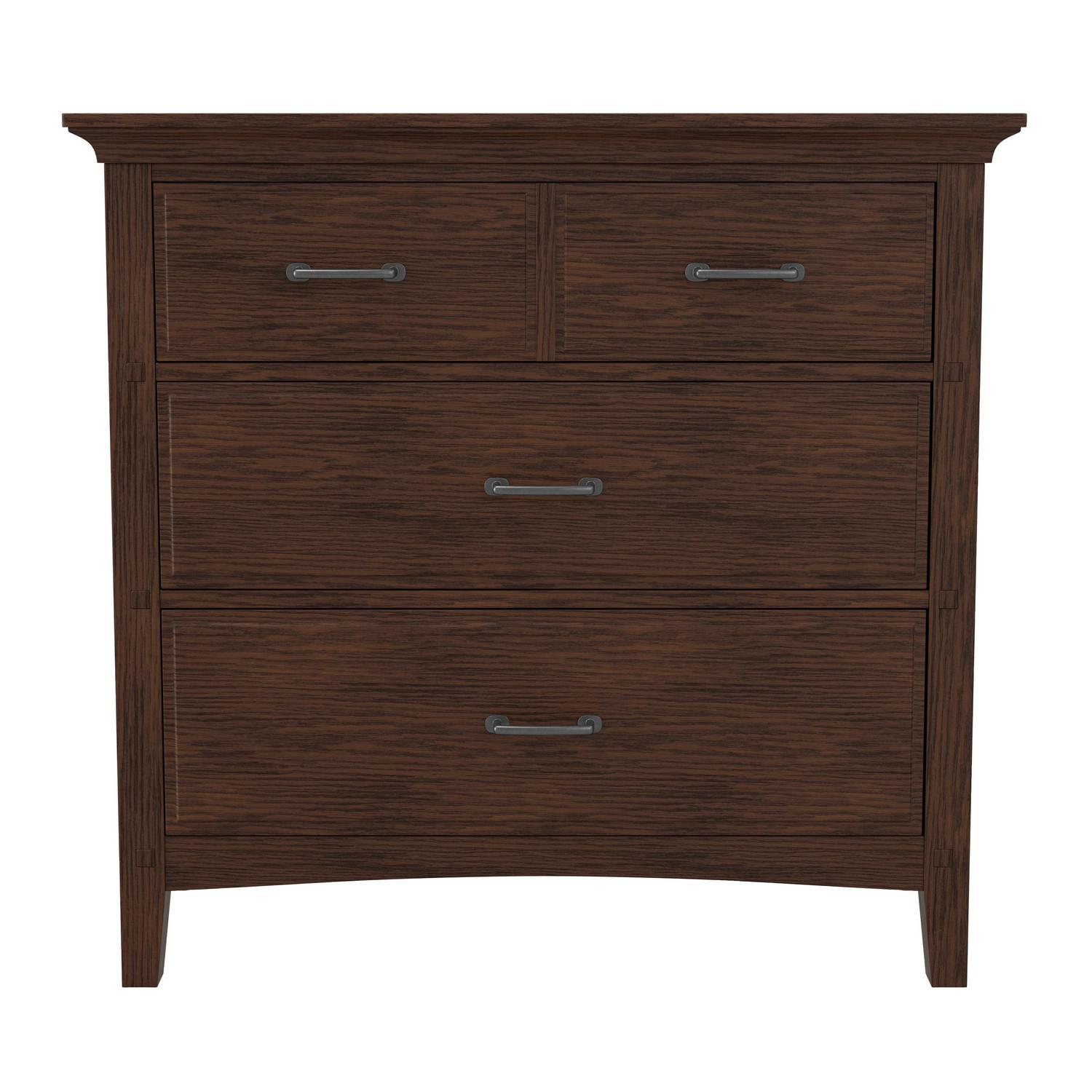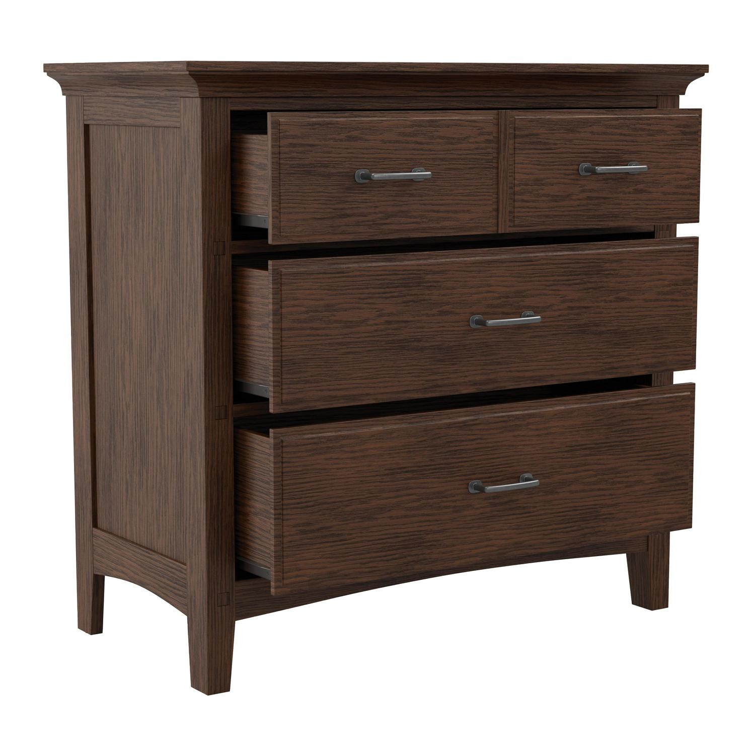 The Modern Mission Collection is an updated version of the traditional Craftsman design. The renewed look has enhanced darker hues in the finish with a deep oak grain look and feel. The five step finishing process is perfectly accented by the beauty of the new gunmetal hardware. The felt lined top drawer is helpful for storing away jewelry or delicates and the two deep storage drawers offer sizeable space for clothing or accessories. All drawers have heavy duty metal side glides for ease of opening and closing. Help ensure your morning preparations with the Modern Mission three drawer Chest .