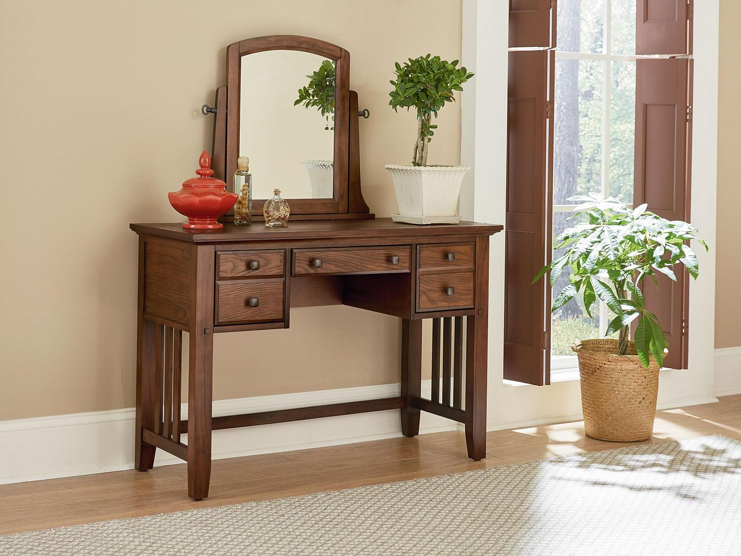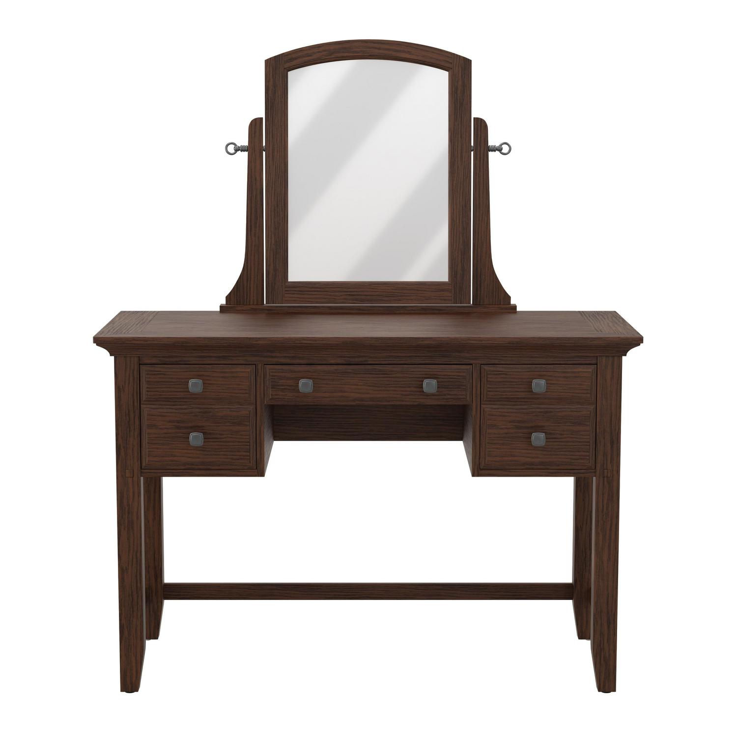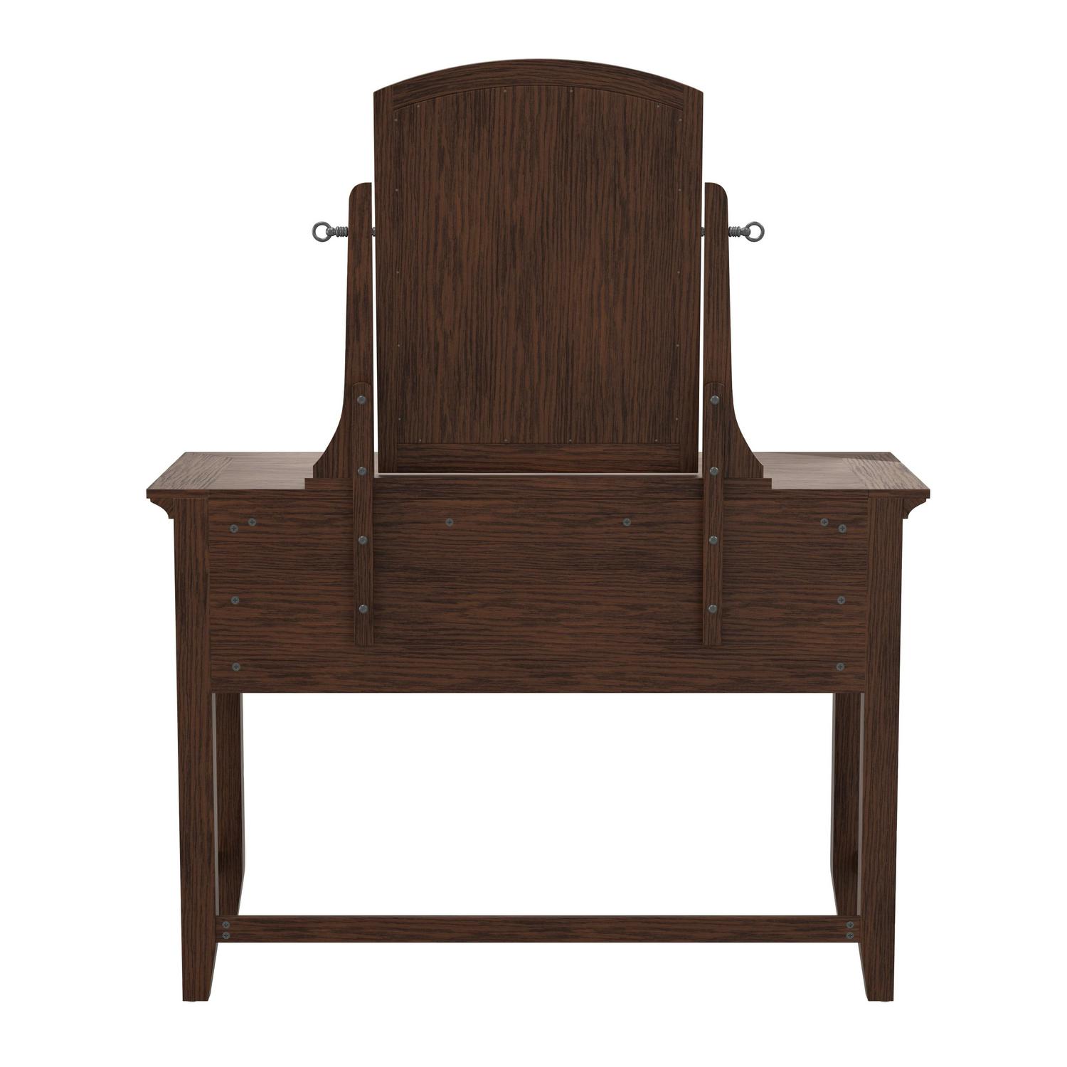 The Modern Mission Collection is an updated version of the traditional Craftsman design. The renewed look has enhanced darker hues in the finish with a deep oak grain look and feel. The five step finishing process is perfectly accented by the beauty of the new gunmetal hardware. The three drawer vanity is beneficial for storing your hair and makeup tools. A generous 44 wide table top provides a large working space and the included beveled mirror swivels 360 degree for adjustability. Help ensure your morning preparations with the Modern Mission vanity and stool set.