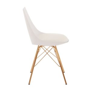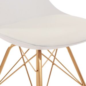 Inspired by minimalist Scandinavian design, the Oakley mid-century modern bucket chair is a classic choice for today s modern home. The timeless style of this modern chair feels right at home in the dining room or home office, bringing a casual yet sophisticated vibe to any space. An attractive crisscrossing gold chrome finished steel legs supports the colorful PP contoured shell, while plush foam padded faux leather seat offers additional comfort and support. More than just a place to sit; it s a super groovy home statement.