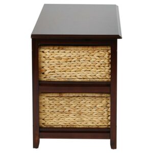 Clean lines and a warm, on-trend design give the OSP Home Furnishings Seabrook 2 Shelf End Table with 4 Baskets plenty of versatility and room-enhancing organization. Solidly built from wood and veneer in your choice of available finishes, this table includes four natural-colored, seagrass baskets for plenty of easily accessible storage. A beveled top completes the look of this piece, keeping your space tidy in a fashionable way.