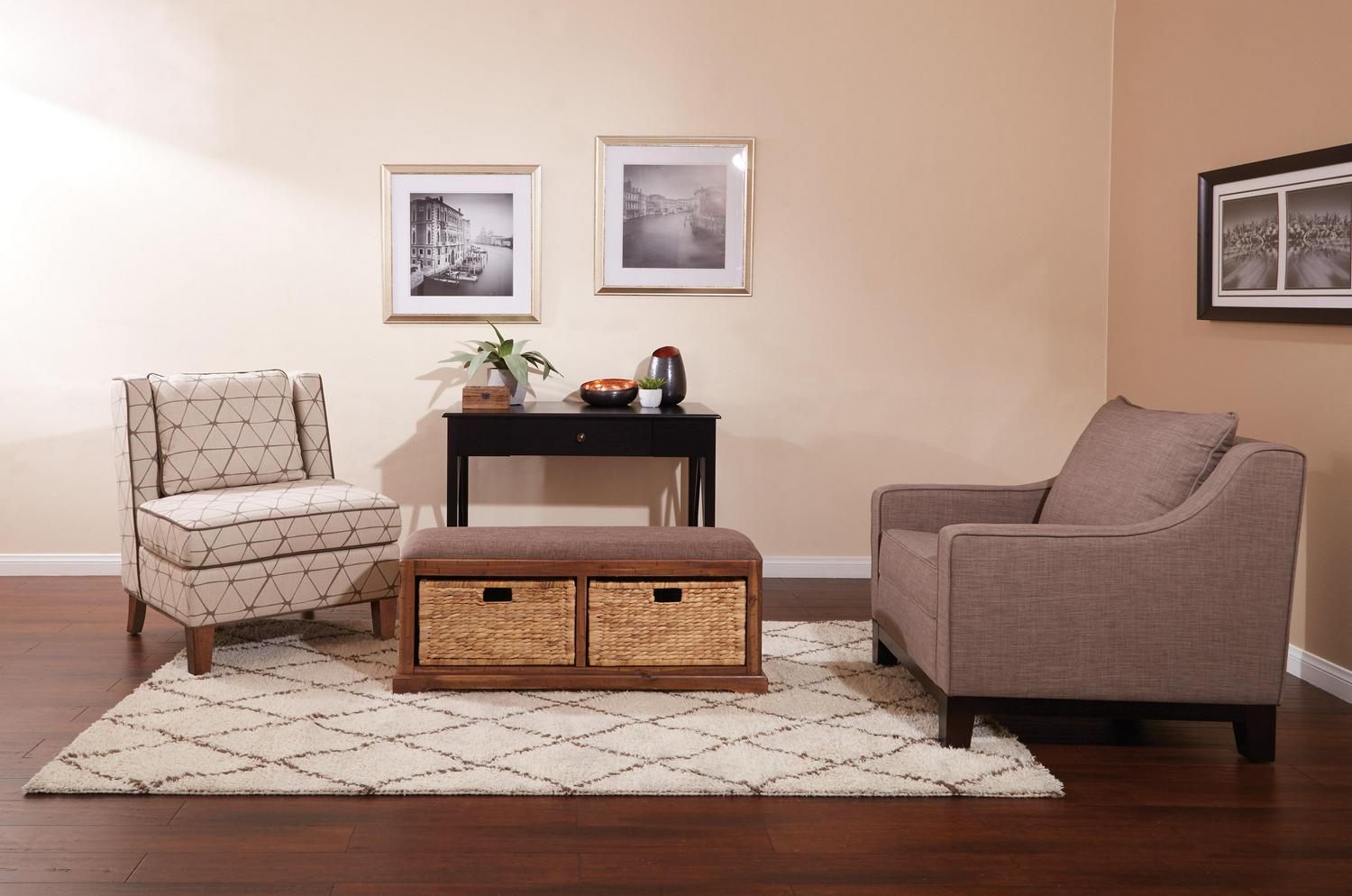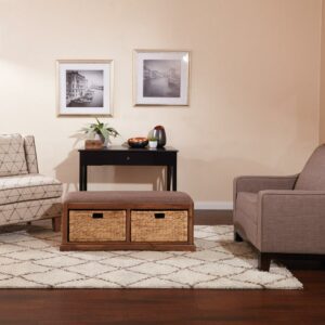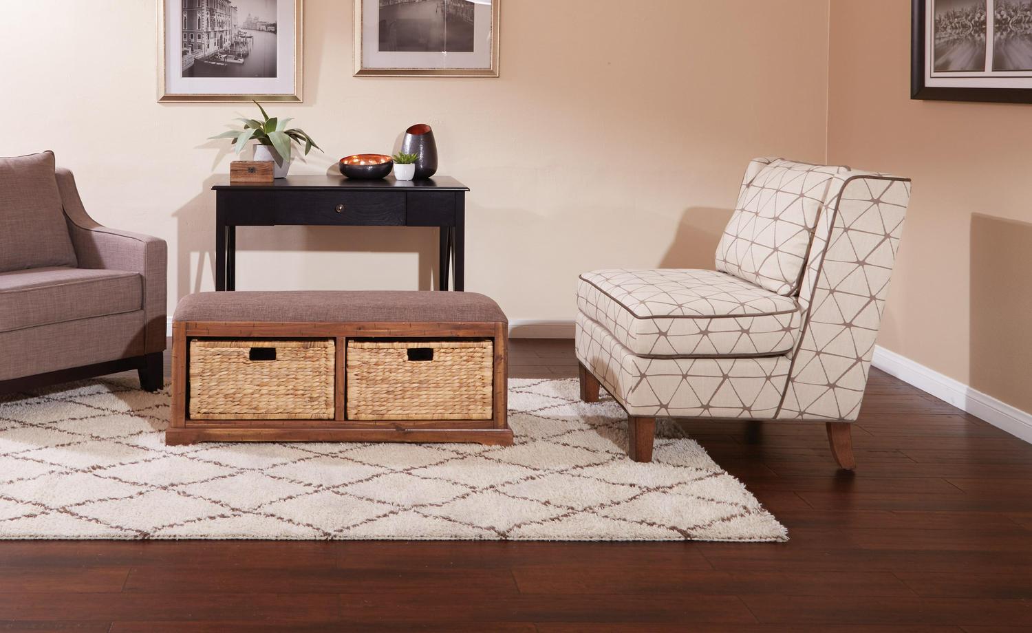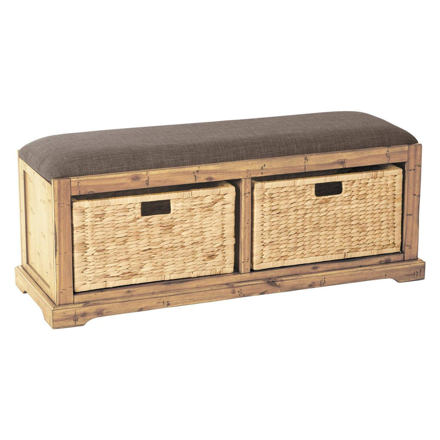 Make yourself at home. An ideal storage solution for the front entry, this storage bench makes it easy to hide away shoes and purses when company visits. You ll love the family friendly, easy care fabric of the bench top, and dual storage baskets. Welcome your friends and family with the rustic style of the Sheridan bench.