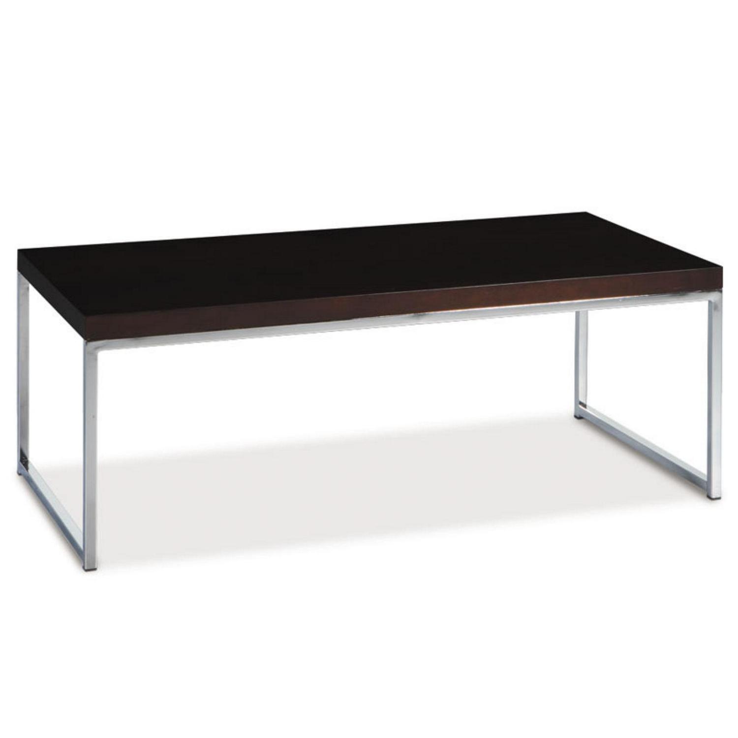 What is cool Cool is real style, not fading fashions. Cool is function, not embellishments. With the new Wall St. Coffee Table with Wood Grain Top and Chrome Plated Metal Frame, your living space will exude an air of distinction and prestige that is certain to be appreciated and loved by all who enter your abode. An undeniably attractive statement piece, this coffee table blends impeccably into a wide range of decors from modern to traditional, transitional to Asian. Durably fabricated with reinforced beam construction and a thick table top that features a flush wood-to-metal edge that provides for a sleek yet beautifully simple appeal, this table is specimen of simple sophistication. Outfitted with light reflective chrome legs and table top parameter, this Wall St. Collection furnishing instantly brightens any space where it is utilized while still retaining its refined demeanor. Add to cart now and start enjoying the Wall St. Wood Grain and Chrome Coffee Table for years to come.