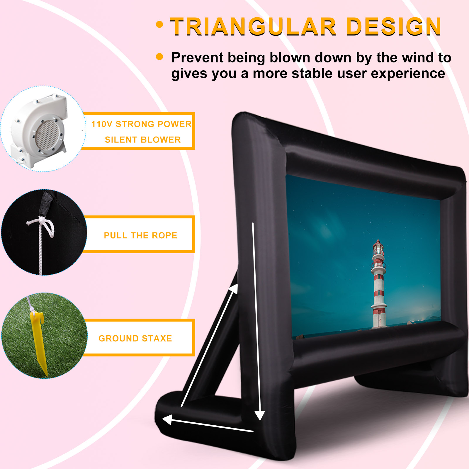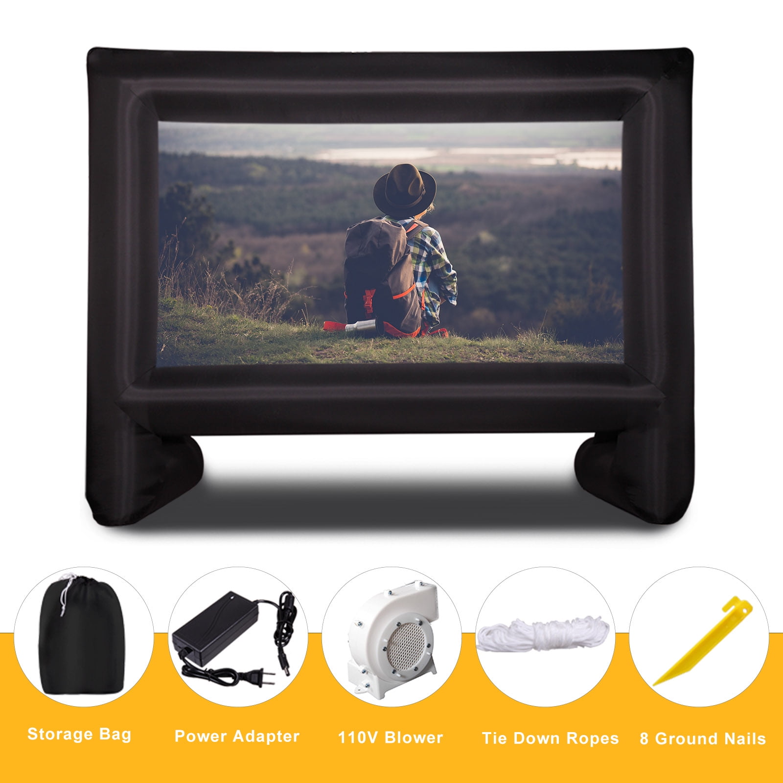 Awesome Outdoor Movie Theater: This mega inflatable movie screen is easy to take from location to location. Enjoy your favorite films on the big screen anytime with your family and friends in the backyard; A nice addition to resorts, outdoor parties, and special events Attractive Design: Our outdoor movie screen allows front and rear projection both ways Works great. Also, this inflatable movie screen is made of high-quality natural polyester fabric, which can be folded or washed without wrinkles or creases, its smooth surface enhances image results and brings you the best watching experience Easy Set-Up And Clean-up: The inflatable movie screen is easy and convenient to set up in 2 minutes or less. Included the air blower, rope, tent, and inflatable stake. After your event, this blow-up movie screen collapses for fast clean-up Portable Storage Bag: Our inflatable projector screen for the outside comes with a large daily storage bag for you to take wherever you want. It is very convenient for you when you finish camping adventures, picnics, outdoor birthdays, pool parties