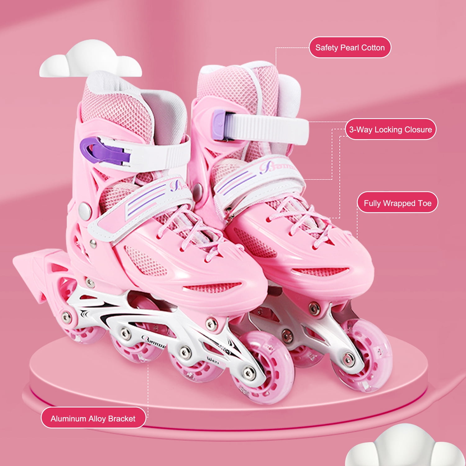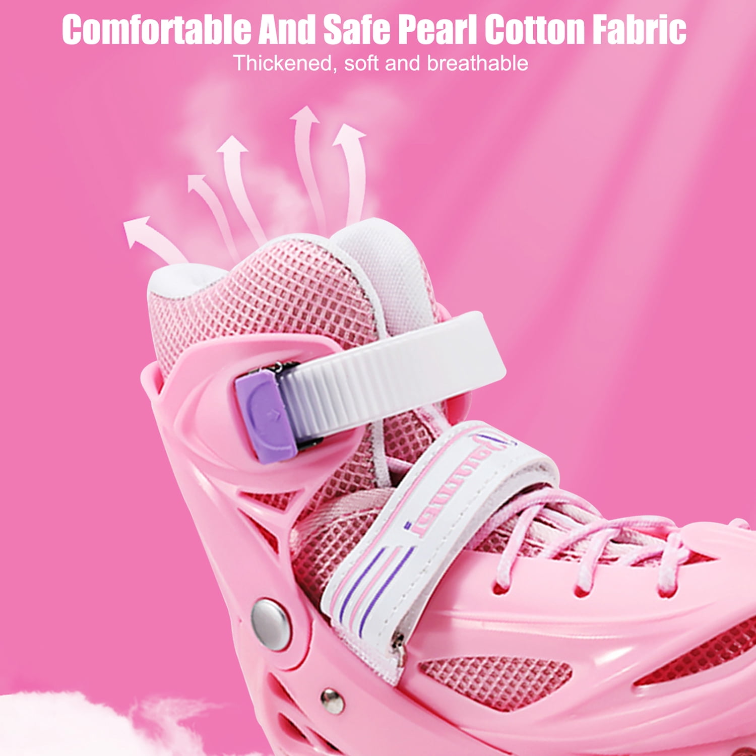 The Otufan Combination Roller Skates offer a 2-in-1 design, allowing you to switch between inline skates and quad roller skates with ease. The adjustable size feature accommodates different foot sizes and ages, ensuring a perfect fit. With a triple protection system, including a secure buckle, magic tape, and reinforced laces, these skates provide reliable and secure protection for children. The sturdy triangle frame enhances stability, while the high-quality PU wheels offer durability, noise reduction, shock absorption, and anti-slip protection. Designed for comfort and safety, these skates feature a shock-absorbing shell, soft protective layer, and breathable fabric, ensuring maximum protection and a comfortable wearing experience for children. Size Chart XS: Inner length of shoe: 6.69-7.48in, suitable for boys or girls aged 3-7 years old S: Inner length of shoe: 7.48-8.26in, suitable for boys or girls aged 6-12 M: Inner length of shoe: 8.26-9.05in, suitable for 10-13 years old and adult boys or girls