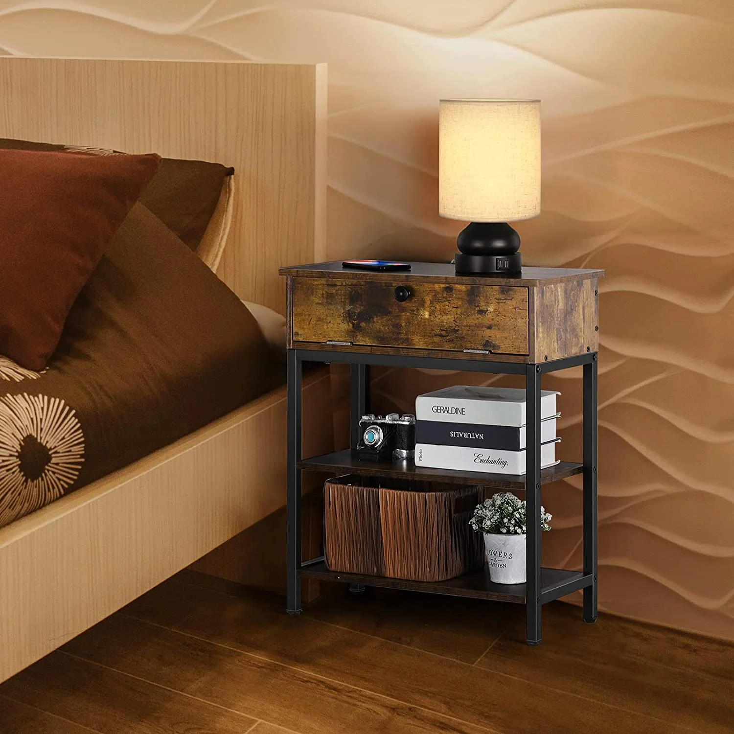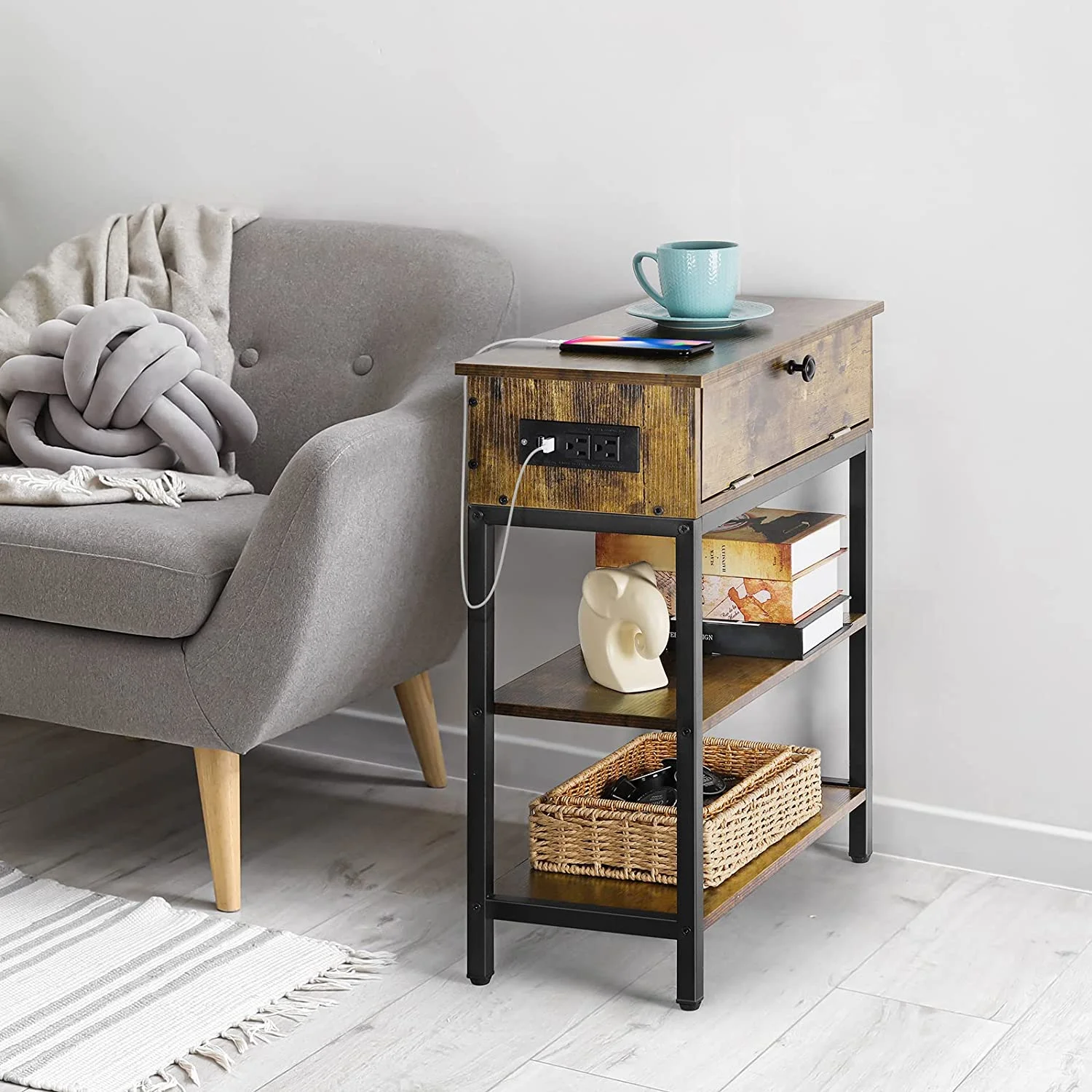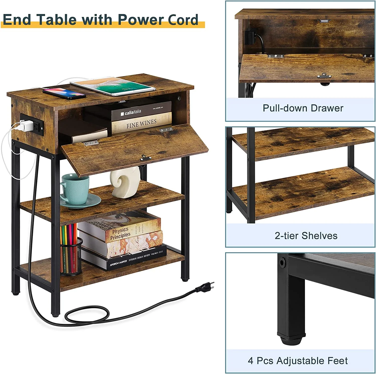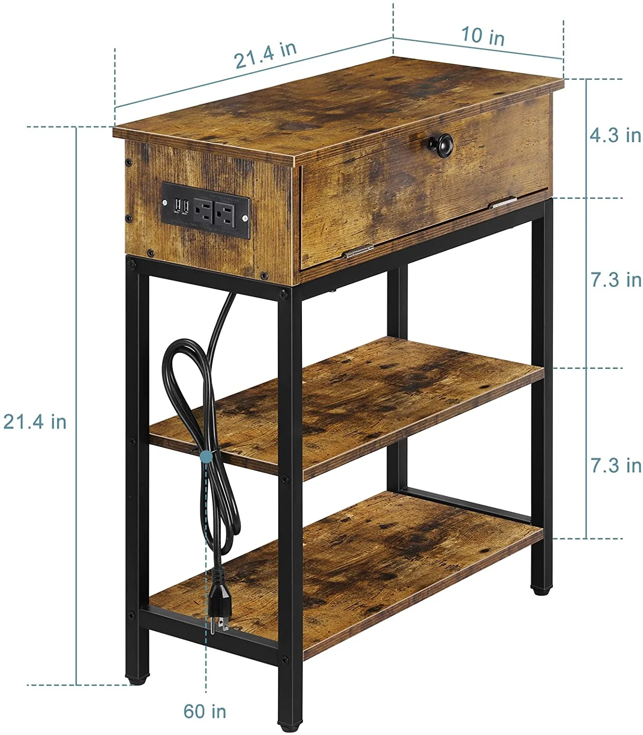 [End Table with Charging Station] Don’t need to worry about the low battery. The end table includes 2 outlets and 2 USB ports with a 60in the power cord to satisfy your charging needs. No need to look around, it can easily charge your mobile phone, tablet, lamp, or laptop, and get everything you need within reach. [Versatile & Convenient Side Table] Narrow side table with a drawer and 2 shelves offer you ample space for storage. you can place your decorative stuff, phone, lamps, books, etc. The pull-down drawer will help you organize your remotes, books, phone charger cords, glasses box and etc. [Perfect Sofa Side Table] The narrow nightstand table is designed with metal frames and wood board, which would meet the various daily needs. With vintage and Industrial Style, perfect combination with other furniture in your living room or bedroom. [Easy to Setup and Clean] This side table comes with numbered parts and clear instructions to help you finish the assembly easily. The tabletop is waterproof heat-resistant and dust-free you just need a damp cloth to keep the table clean. And The end table can fit on a variety of floors by adjusting the feet pad.