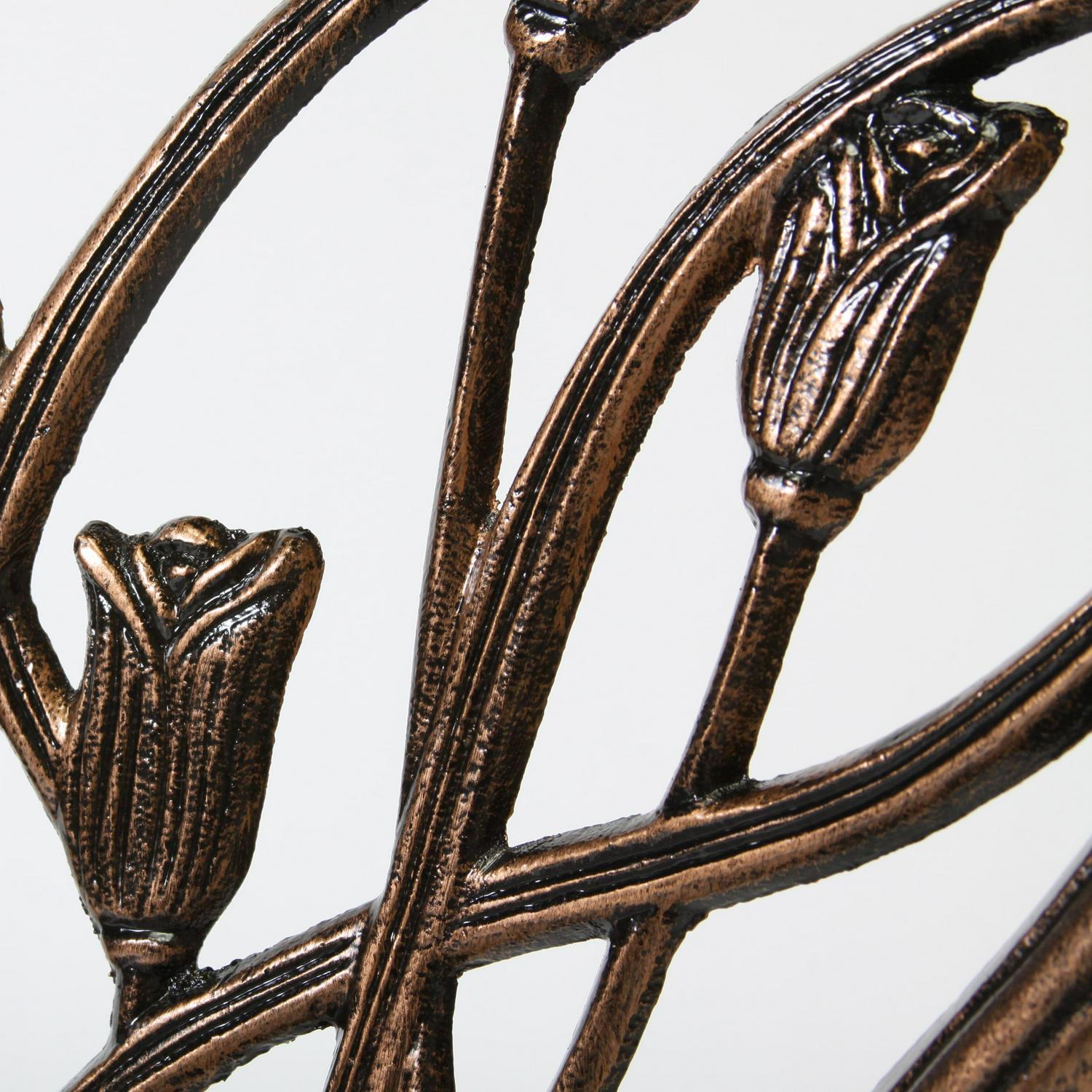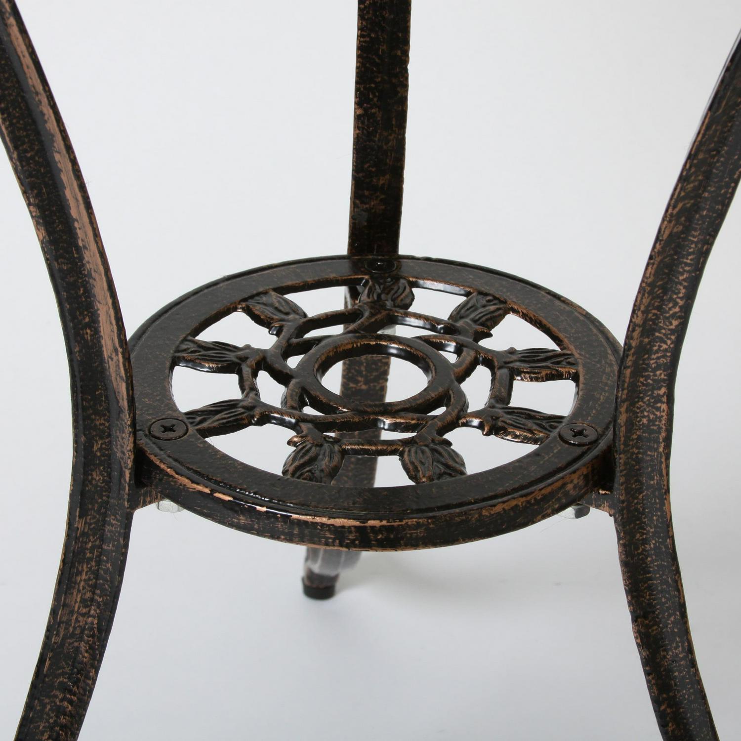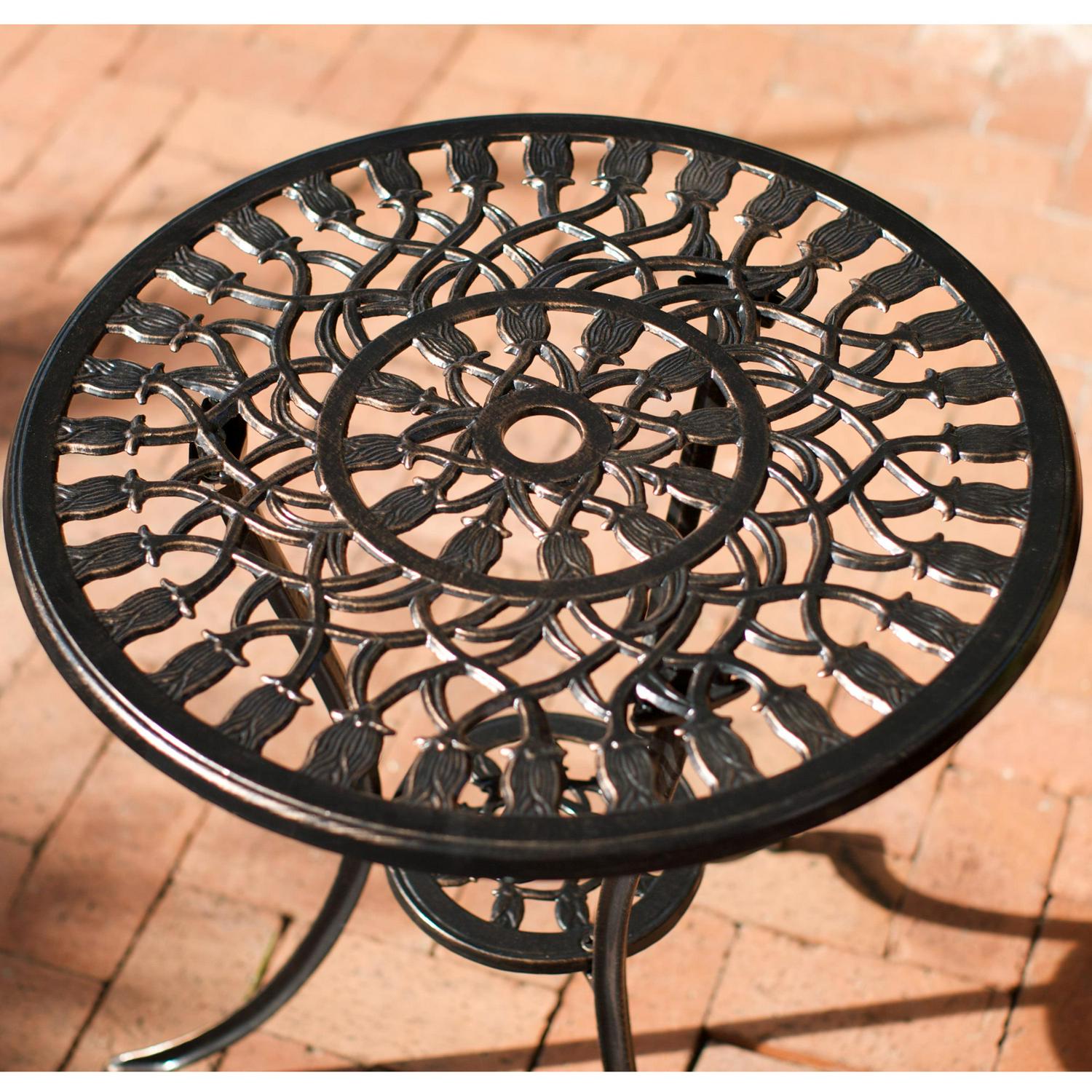 Enjoy outdoor dining in the comfort of your own backyard with this attractive cast-aluminum bistro set. The compact size of this outdoor bistro set makes it easy to fit in smaller areas, including a front porch or apartment patio. The sturdy aluminum construction is durable enough to hold up under heavy use, and the playful tulip design adds a touch of whimsy. This outdoor bistro set offers durable cast aluminum construction with a lovely tulip-themed design. When the warm copper tone of this three-piece set is combined with the truly artistic detailing, any outdoor living area is instantly transformed into a stylish space for relaxation and rejuvenation.