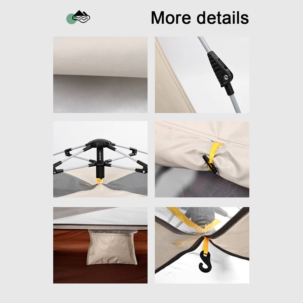 Outdoor Camping Tent, Automatic Pop-Up Waterproof Tent Quick and easy setup with a fully automatic structure and upgraded spring support. Durable 210D oxford cloth silver-coated material for rain and sun protection during leisure and camping. Double-door design for improved ventilation. Spacious interior to accommodate a family. Built-in storage mesh bag and hook for convenience. Includes a carrying bag for easy transportation and storage. Color: Beige. Material: Metal and oxford cloth. Installation size: 94.5 * 94.5 * 60.6in. Weight: 9.7lb. Package size: 33.9 * 6.3 * 6.3in. Package weight: 10.4lb.
