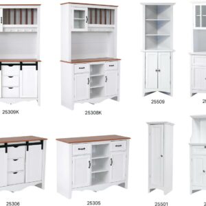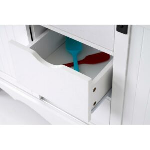 Re-create the feel of years past with the functionality of the present with the OS Home Countryside Sliding Barn Doors Buffet Cabinet and Hutch. Crisp white painted surfaces, antique style detailing, and a warm pine laminated top, make the Countryside collection a perfect addition to any kitchen or dining area. The included Hutch offers attractive display features including a framed glass door, wooden plate dividers and wood cup holders. Multi-Functional cabinet utilizing 2 sliding barn style doors to conceal dishes, glassware, or table ware. In addition, 3 pull-out drawers maximize useful storage space. Ample open space for decorative items, or utilize the space for additional storage or your necessary kitchen or dining accessories. The warm pine laminated top adds a nice compliment to the crisp white painted doors and drawer fronts.