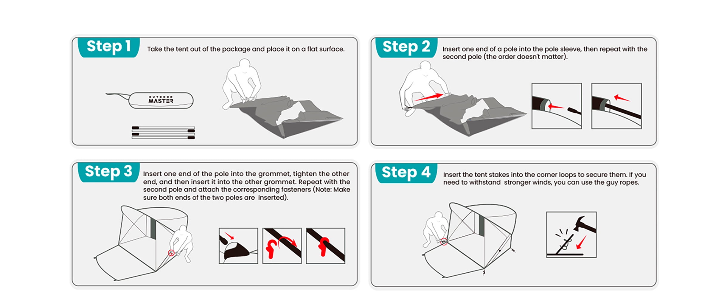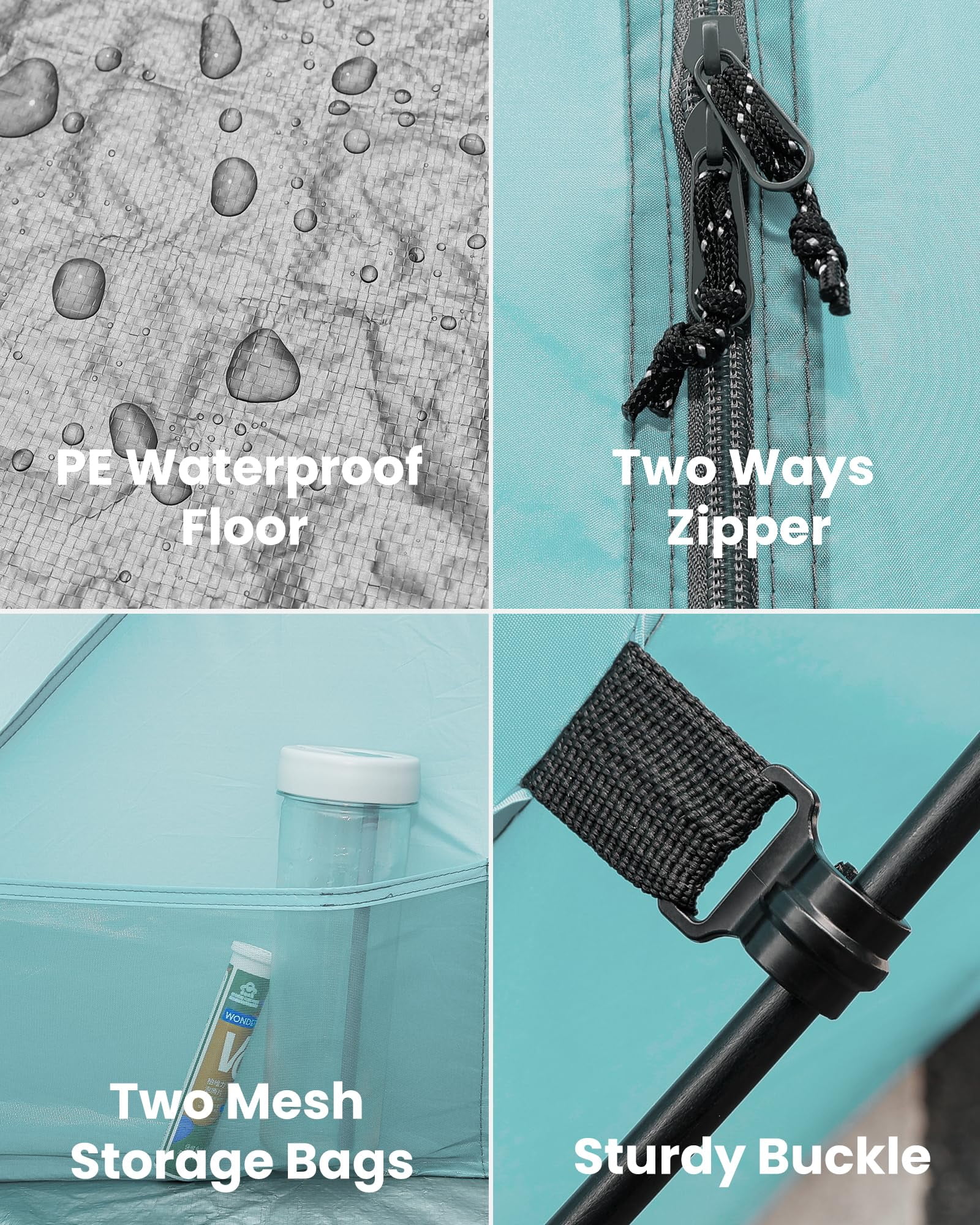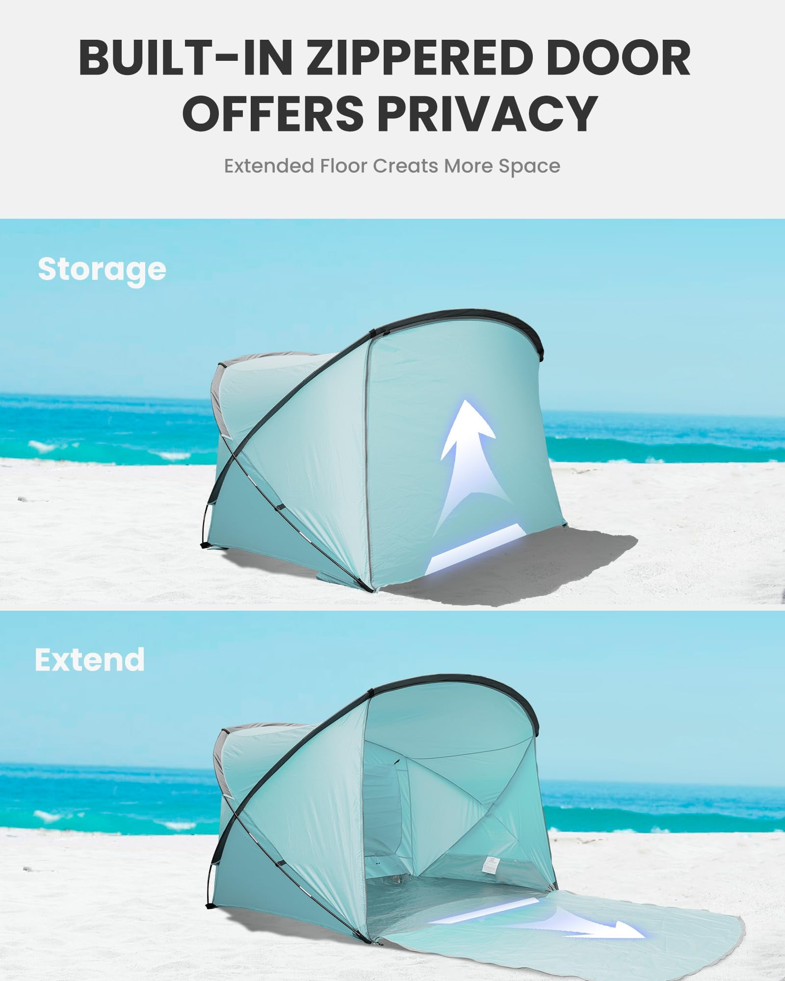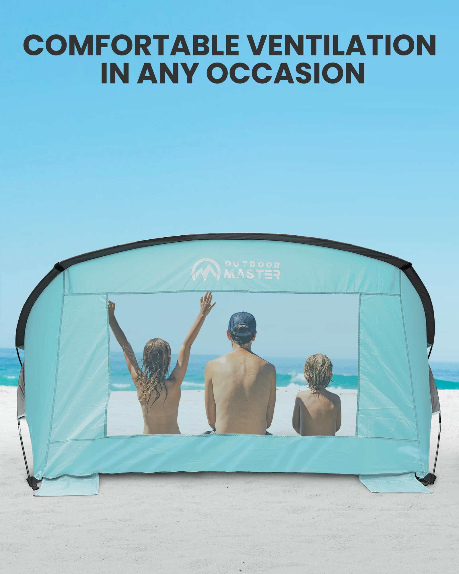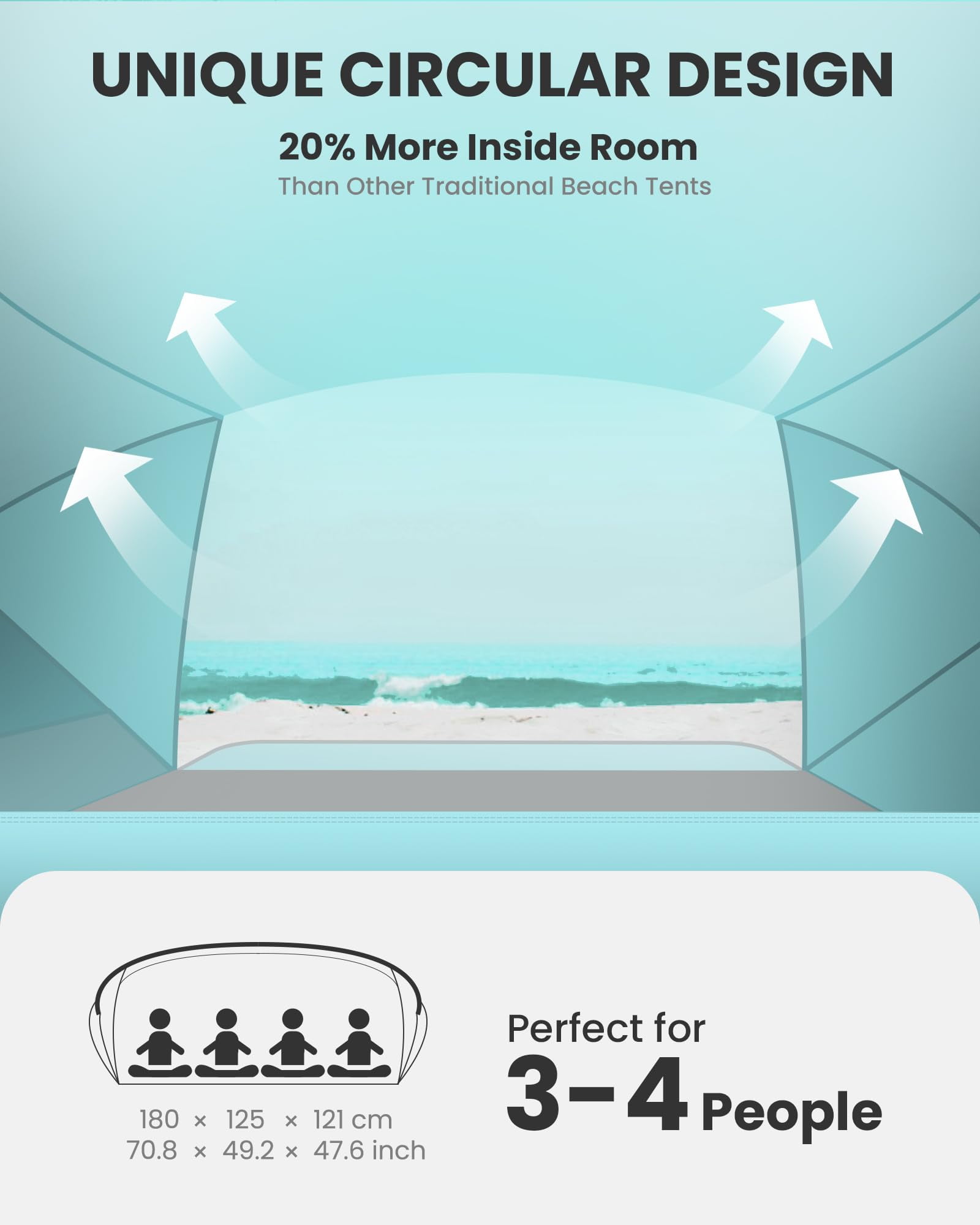 SPACIOUS INTERIOR FOR WHOLE FAMILY : The unique circular design of the tent allows for a 20% increase in capacity compared to the regular triangular design. OutdoorMaster beach tent enough room for 2 adults and 1/2 kids to sit in the inside. Ideal for family car camping or camping site. UPGRADED & DURABLE DESIGN: We increased the thickness of the fiberglass frame from 7.0mm (market standard) to 8.0MM, will be safer, more durable and rust free, which support tent stably stand by itself and keeps shape after long time use. EASY SET UP & CARRY: Setting up fast within minutes. Our beach tent sun shade is much easier to fold than other beach tents. It could fold down to a travel size of 16.77 x 7.8 x 6.24 inches, lightweight and easy to fold down with a compact carrying bag for easy travel and storage. UPF 50+ PROTECTION & WEATHER PROOF: Our beach tent is made of premium 210T sun-proof material coated polyester, it can effectively block heat and 98.5% of the harmful UV rays. Rated 4000mm PU coating, this beach tent is completely weather proof, ensuring you stay dry even during rain or light snow. VERSATILE DESIGN: Our tent for beach built-in ZIPPERED DOOR offers privacy to change into dry clothes. The EXTENDED FRONT FLOOR provides extra room for more activities. The sun shade with ample mesh panels allow views and enhances cross-ventilation to help manage condensation.