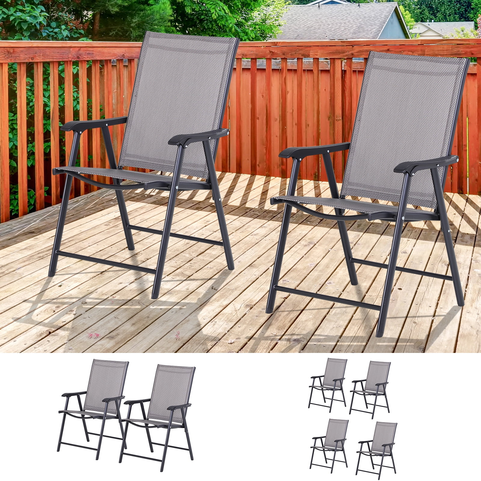 Lawn Chairs: Our outdoor folding chair set gives you the ability to pack up chairs and bring them with you on the road. With seats for a group, you can enjoy camping, cookouts, tailgating parties, trips to the beach, and all sorts of other outdoor events. Folding Chairs for Outside: Outdoor-ready folding chairs give you the option to supply seating as needed. They’re easy to carry and quick to store, saving space in your trunk or garage and allowing you more room for necessities. Outdoor Comfort: Bring comfort on the go; our outdoor folding chair set features a breathable sling mesh. Stay cool during the summer with material that lets the wind flow through. Armrests sit on each side, and tilted backrests offer a laidback, cradling sitting position. Outdoor Ready Chairs: These folding chairs offer a heavy-duty 242 lbs. weight capacity thanks to their powder-coated steel frames. The powder coating helps make them safe around water, and sling fabric allows a design that dries easier than other fabrics, making each element outdoor-ready. Outdoor Folding Chairs Info: Overall Dimensions: 22.75″ L x 25.25″ W x 37″ H. Weight Capacity (per chair): 242 lbs. No assembly required. Specifications: Color: Gray, Black Materials: Steel, Mesh Fabric Chair Size: 22.75″ L x 25.25″ W x 37″ H Seat Size: 17.75″ W x 18.5″ D Backrest Size: 22.5″ L x 17.75″ W Folded Size: 33.75″ L x 22.75″ W x 6.75″ H Weight Capacity: 242 lbs.